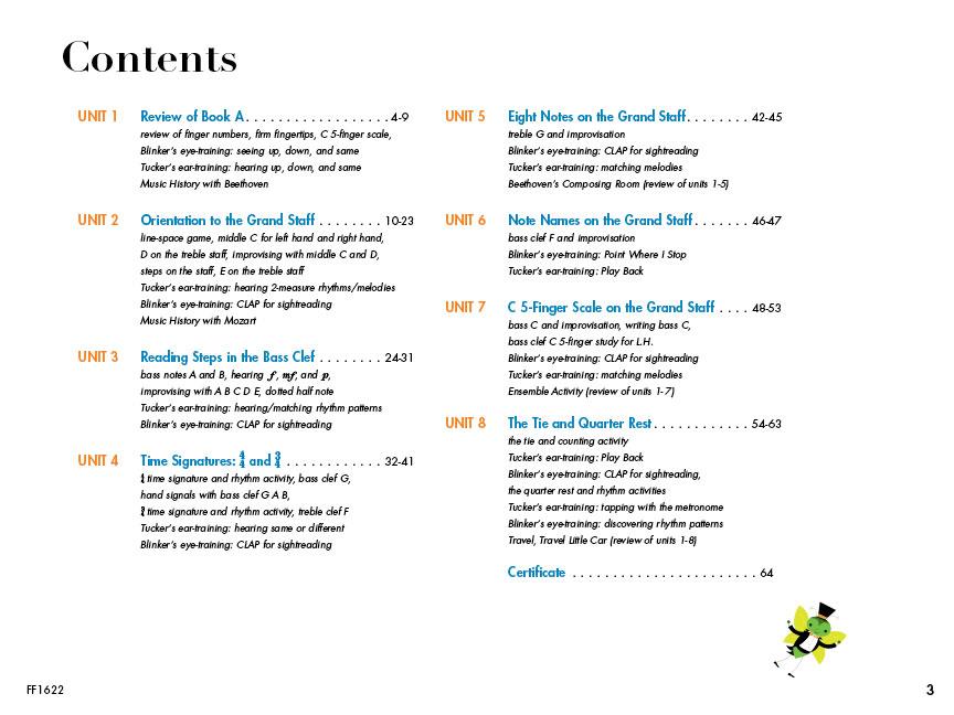 My First Piano Adventure Writing Book B includes 64 pages of fun-filled activities support the music learning process. Reading steps on the staff is a primary focus of Book B. The inventive Writing Book guides young players in reading, hearing and creating with steps on the Grand Staff. Teachers will welcome the special "C.L.A.P. for Sightreading” pages, designed to reinforce and celebrate note-reading. Students touch on music history with Mozart's and Beethoven's Fun Facts and Games and take a peek into Beethoven's Composing Room. Tucker, Blinker and Tap return with ear-training, sightreading, and rhythm fun. Then there is also the Tooth Fairy Visit, Rhythm Beads, Escape of the Quarter Notes... and much more.