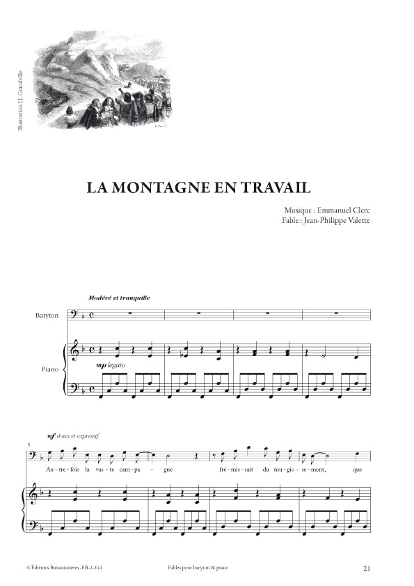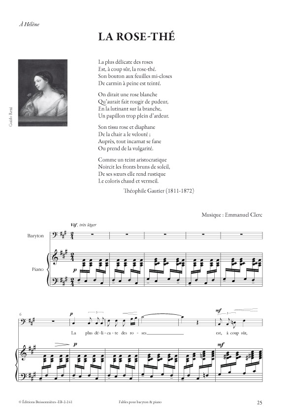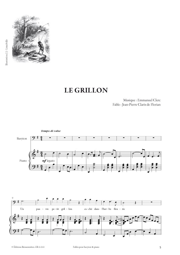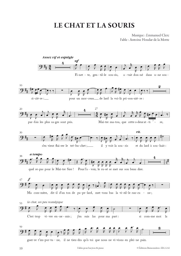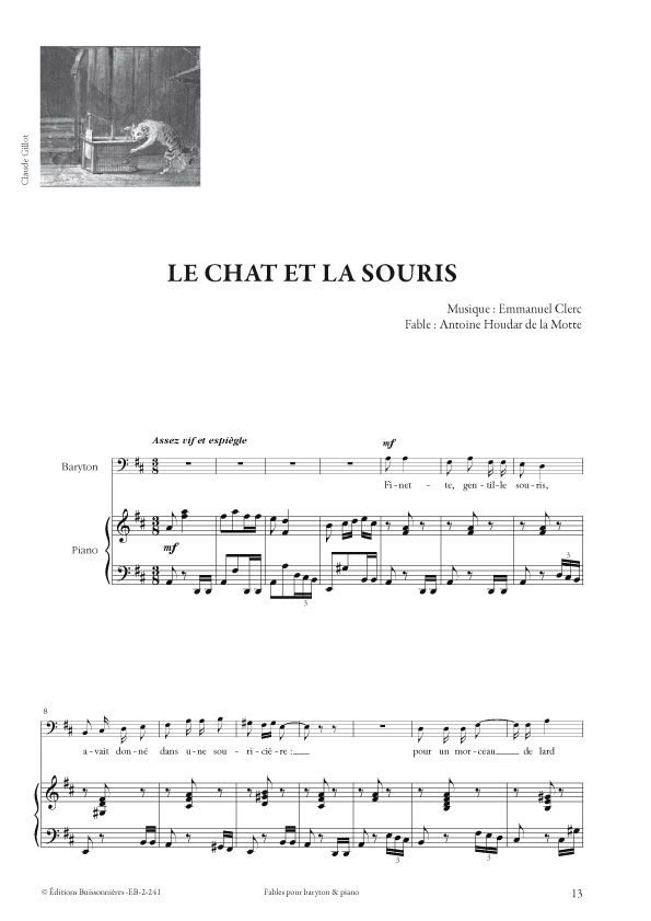 Quatre textes mis en musique pour BARYTON et piano : une évocation du grillon qui vit caché et heureux, du chat qui sert en voulant nuire, de la montagne qui accouche d'une souris, et enfin de la rose-thé, la plus délicate de toutes !
