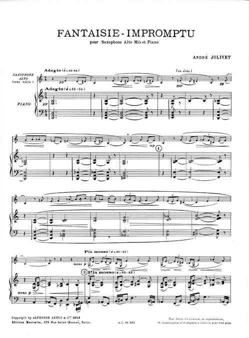 André Jolivet (1905-1974) established his love for composition from a young age. This remained throughout his life, and he held the post of Professor of Composition from 1966-1970 at the Paris Conservatoire. Impromptu Fantasy for Alto Saxophone and Piano was published in 1953, and remains highly regarded. Jolivet, himself a cellist, wished to explore composition for all instruments, and therefore has a considerable number of works in all fields. The composer's style is also known for its spirituality, and the desire to associate the everyday with the magical, and the human with the universal. Jolivet draws on acoustics and atonality, as heard in his Impromptu Fantasy. Thepiece requires advanced skills due to its use of complex rhythms and harmonics. For all advanced saxophonists, Jolivet provides an exciting, alternative piece for the instrument's repertoire.