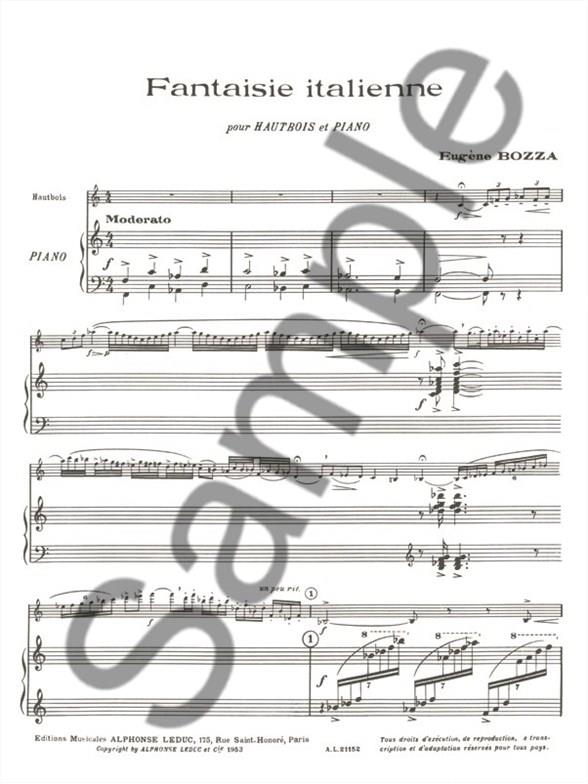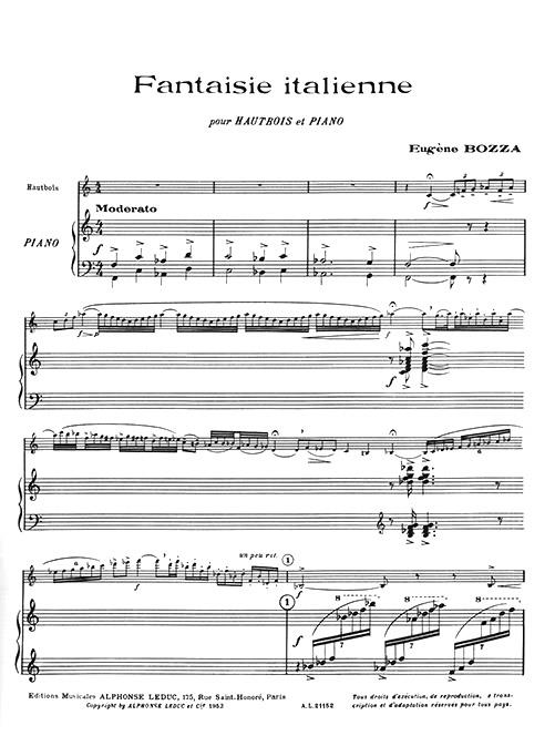 The great Fantaisie Italienne is a piece composed by Eugène Bozza for Oboe and Piano. Quite difficult, it requires some advanced skills to be executed perfectly. Starting Moderato, it opens with a cadenza which includes some solo Oboe sections and continues with a short and lyrical melody. It closes on a nice rhythmic section in Allegro. Really nice to play and to listen to, Fantaisie Italienne would make for a fantastic demonstration of your skills and technical abilities during a recital and a concert. Eugène Bozza won different prizes atthe Conservatoire de Paris, such as the First Prizes for the Violin, conducting and composition, as well as the Grand Prix de Rome. He composed several operas, chamber works and ballets among others.