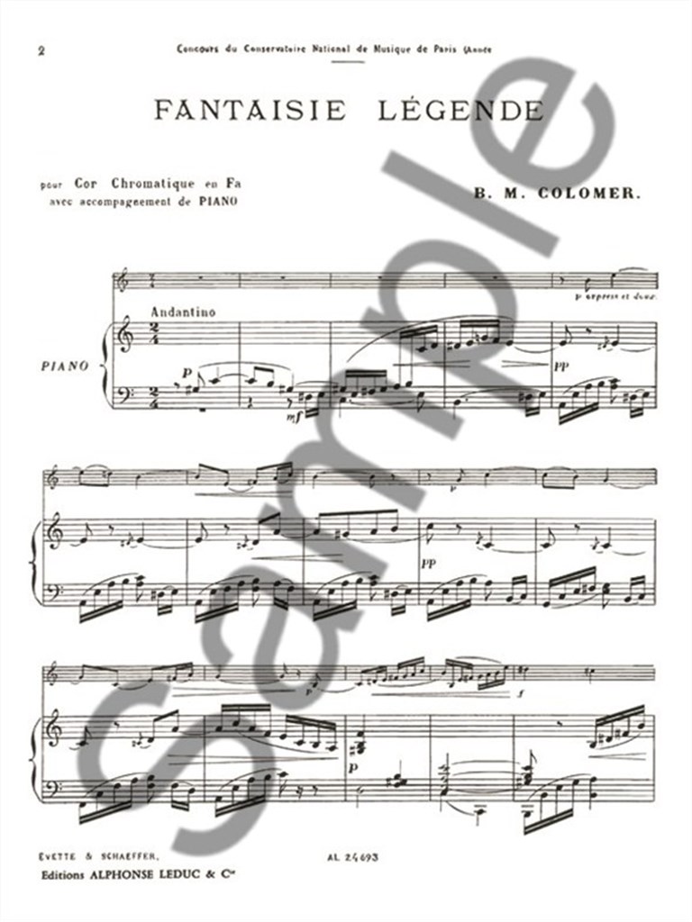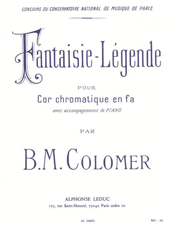 Blai Maria Colomer (1833-1917) was a Spanish pianist and composer. Following his studies at the Paris Conservatoire, he led a successful career as a teacher and composer. He is best remembered for his operas, yet his Fantaisie Legende for Horn remains popular as a competition work at the Paris Conservatoire. Fantaisie Legende is a chromatic work for Horn in F first popularised in the 1899 solo Horn contest at the Paris Conservatoire. Fantaisie Legende exploits chromatic techniques by use of complex rhythms and variations in articulation, as well as lyricalpassages. For all advanced Horn players seeking extravagant repertoire, Colomer 's Fantaisie Legende provides an exciting addition to the repertoire.