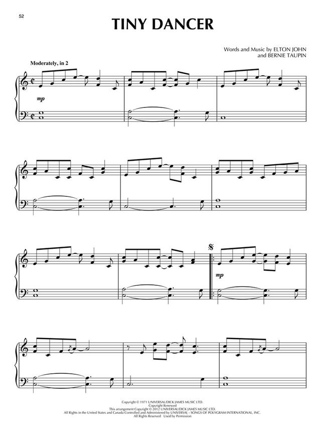 11 de Elton John meilleur arrangés pour piano solo: Blessed - Candle in the Wind - Don't Let the Sun Go Down on Me - I Want Love - Lucy in the Sky with Diamonds - Nikita - Someday Out of the Blue (Theme from El Dorado) - Something About the Way You Look Tonight - Sorry Seems to Be the Hardest Word - Tiny Dancer - Your Song.