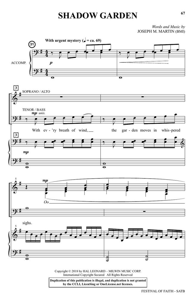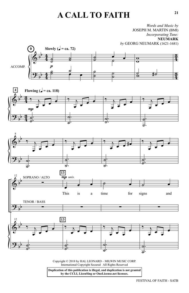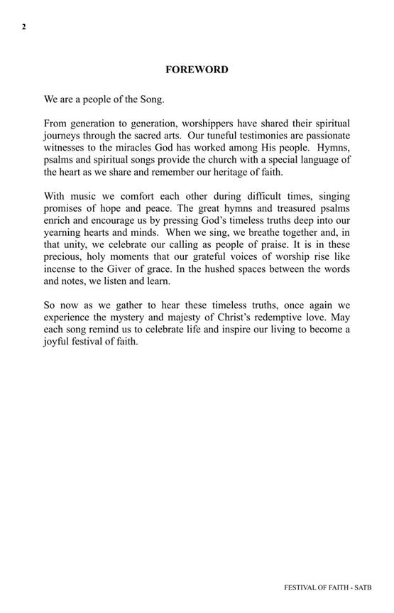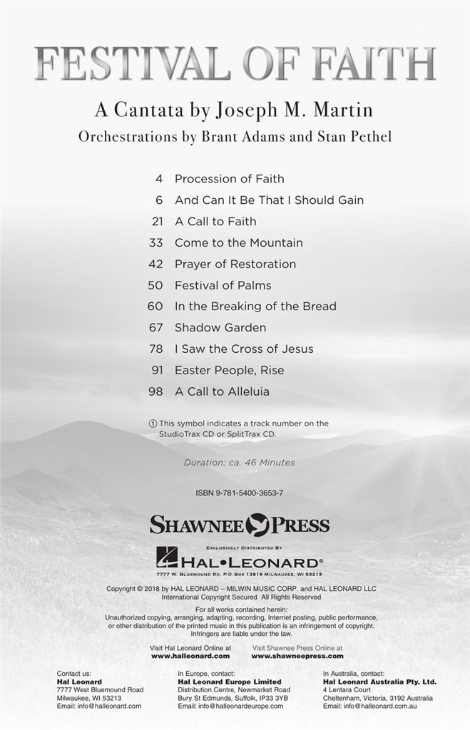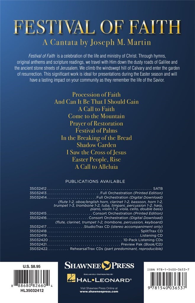 Festival of Faith is a celebration of the life and ministry of Christ. Through hymns, original anthems and scripture readings, we travel with Him down the dusty roads of Galilee and the ancient stone streets of Jerusalem. We climb the windswept hill of Calvary and enter the garden of resurrection. The orchestration creates a soundscape for this dramatic retelling and a full line of companion products are available to support your rehearsals and performance. This significant work is ideal for performances during Eastertide and will have a lasting impact on your community as they remember the life of the Savior. Songs include: Procession of Faith- And Can It Be That I Should Gain- ACall to Faith- Come to the Mountain- Prayer of Restoration- Festival of Palms- In the Breaking of the Bread- Shadow Garden- I Saw the Cross of Jesus- Easter People, Rise- A Call to Alleluia. Score and Parts for Full Orchestra (fl 1-2, ob/enghn, cl 1-2, bn, hn 1-2, tpt 1-3, tbn 1-2, tba, timp, perc 1-2, hp, pno, vn 1-2, va, vc, db) and Consort (fl, cl, tpt 1-2, tbn, perc, kybd) available as a Printed Edition and as a digital download.