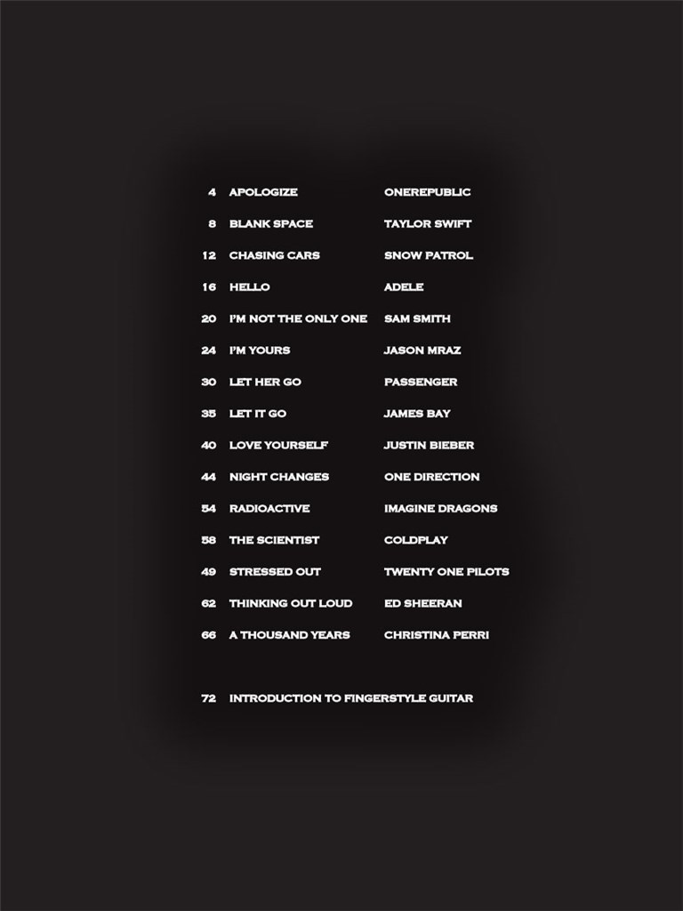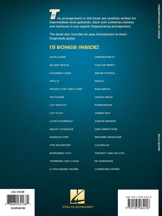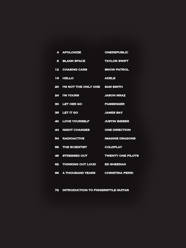 This collection features 15 recent hits in solo Guitar arrangements in standard notation and tab. Each intermediate level solo combines melody and harmony in one superb fingerpicking arrangement.