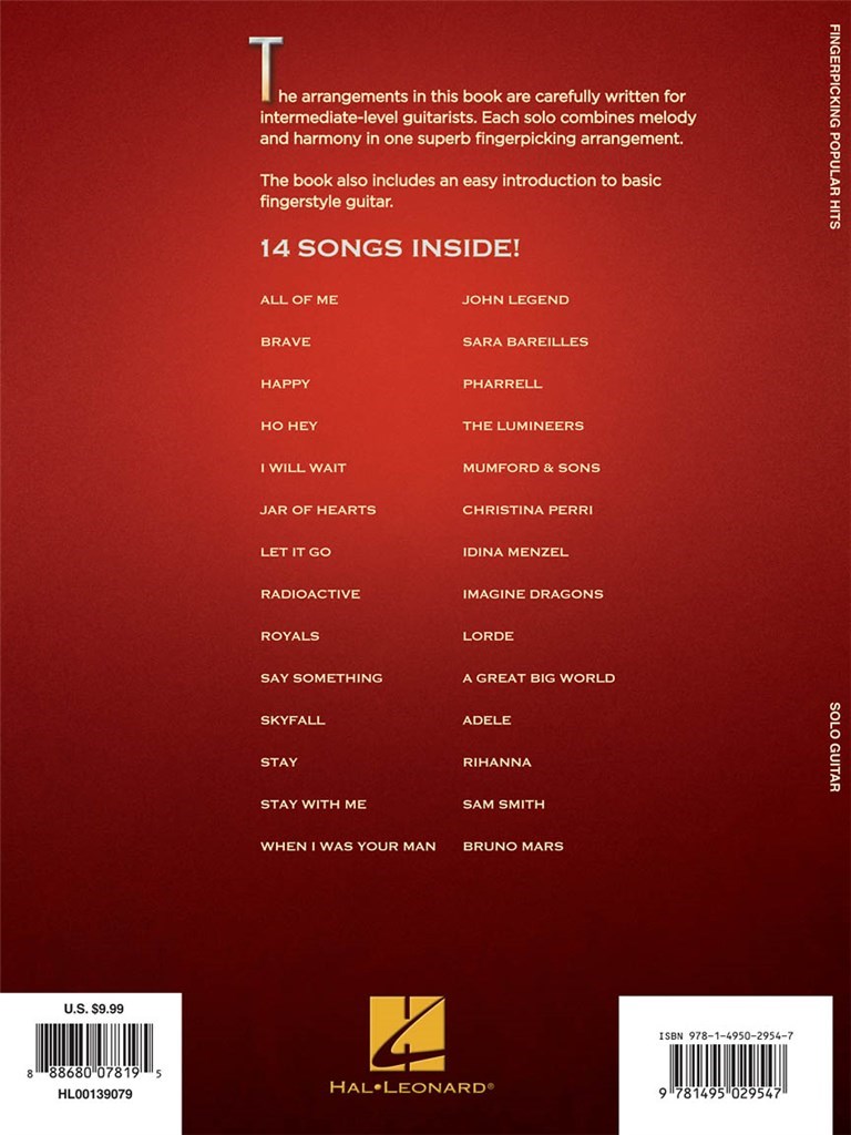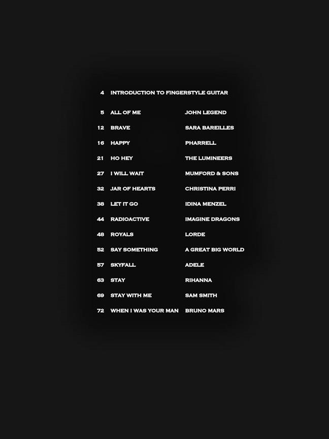 Mélodie et harmonie sont combinées en superbes arrangements solo de fingerpicking dans cette collection de 14 tubes pop hot. Les chansons sont présentées en notation standard et en tablature et sont soigneusement écrites pour des guitaristes de niveau intermédiaire. Comprend : All of Me - Brave - Happy - Ho Hey - I Will Wait - Pot of Hearts - Let It Go - Radioactive - Royals - Say Something - Skyfall - Stay - Stay with Me - When I Was Your Man.