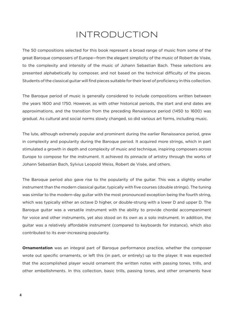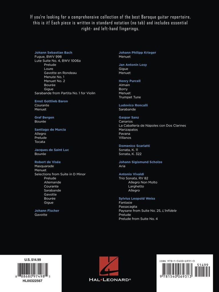 If you're looking for a comprehensive collection of the best Baroque guitar repertoire, this is it! This one-of-a-kind collection includes selections by Johann Sebastian Bach, Robert de Visée, Ernst Gottlieb Baron, Santiago de Murcia, Antonio Vivaldi, Sylvius Leopold Weiss and more. Each piece is written in standard notation (no tab) and includes essential right- and left-hand fingerings.