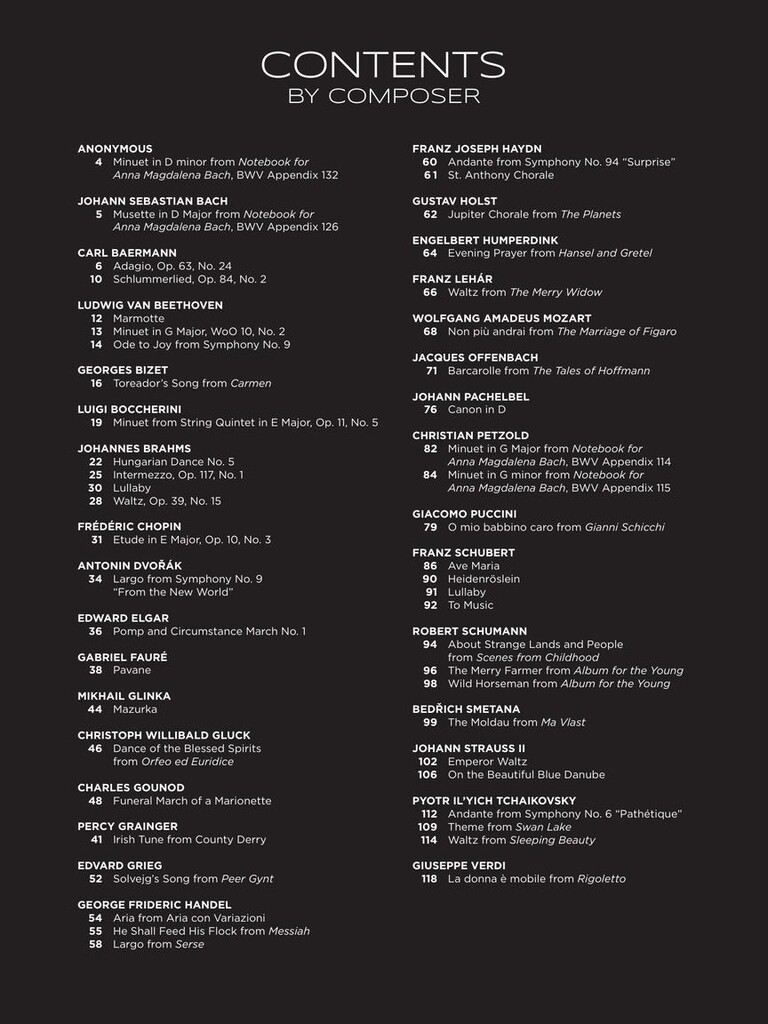 About Strange Lands and People from Scenes from Childhood (Schumann) Adagio, Op. 63, No. 24 (Baermann) Andante from Symphony No. 6 Pathétique (Tchaikovsky) Andante from Symphony No. 94 Surprise (Haydn) Aria from Aria con Variazioni (Handel) Ave Maria (Schubert) Barcarolle from The Tales of Hoffmann (Offenbach) Canon in D (Pachelbel) Dance of the Blessed Spirits […]