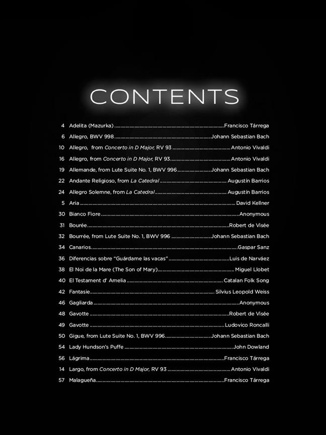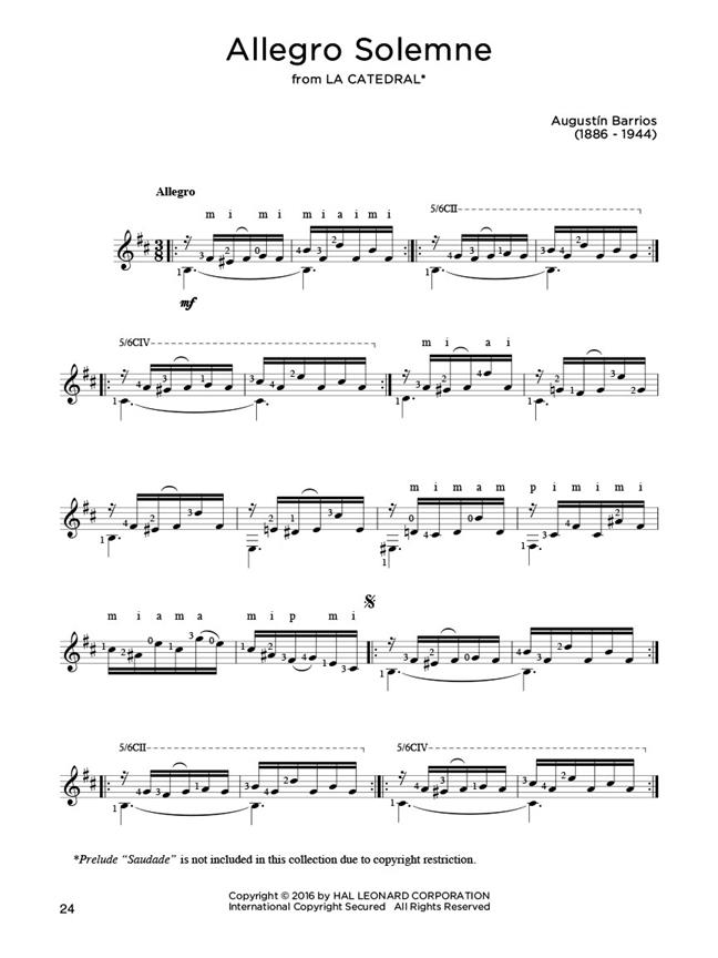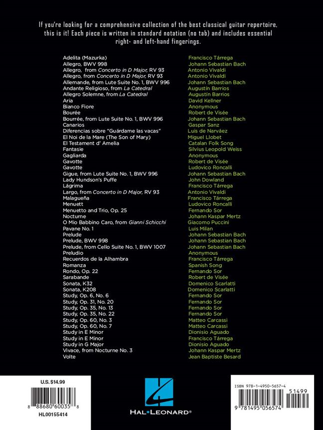If youre looking for a comprehensive collection of the best classical guitar repertoire, this is it! Each piece is written in standard notation (no tab) and includes essential right- and left-hand fingerings. This collection includes compositions by J.S. Bach, Augustin Barrios, Matteo Carcassi, Domenico Scarlatti, Fernando Sor, Francisco Tárrega, Robert de Visée, Antonio Vivaldi and many more.