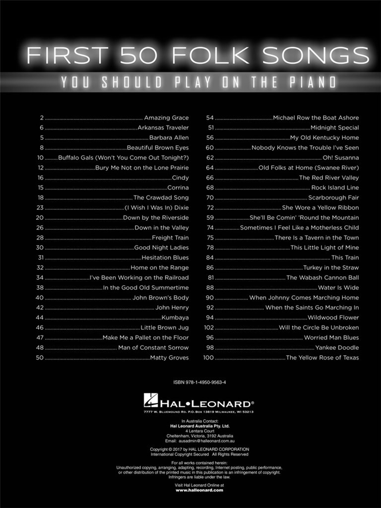 50 great folk favorites simply arranged with lyrics for beginning pianists to learn.