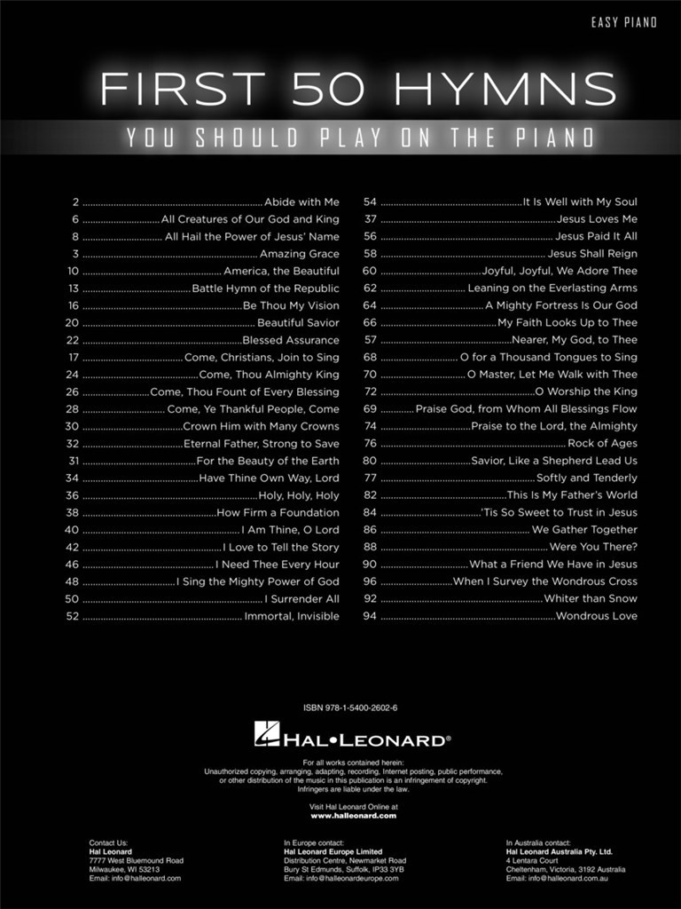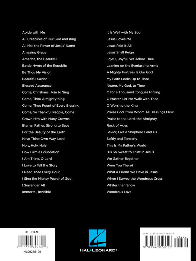 50 timeless hymns for beginning pianists to learn, including: Amazing Grace - Be Thou My Vision - Come, Thou Fount of Every Blessing - For the Beauty of the Earth - Holy, Holy, Holy - I Surrender All - Jesus Paid It All - A Mighty Fortress Is Our God - Nearer, My God, to Thee - Rock of Ages - Were You There? - and more.