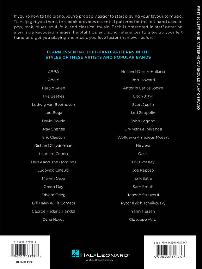 Glow-up your left hand with these essential accompaniment patterns for piano! If you're new to the piano First 50 Left-Hand Patterns will help you to play your favourite music, with must-know patterns for the left hand used in pop, rock, blues, soul, folk, and classical styles. Each is presented in staff notation alongside keyboard images, helpful tips, and song references to get you playing the music you love faster than ever before!