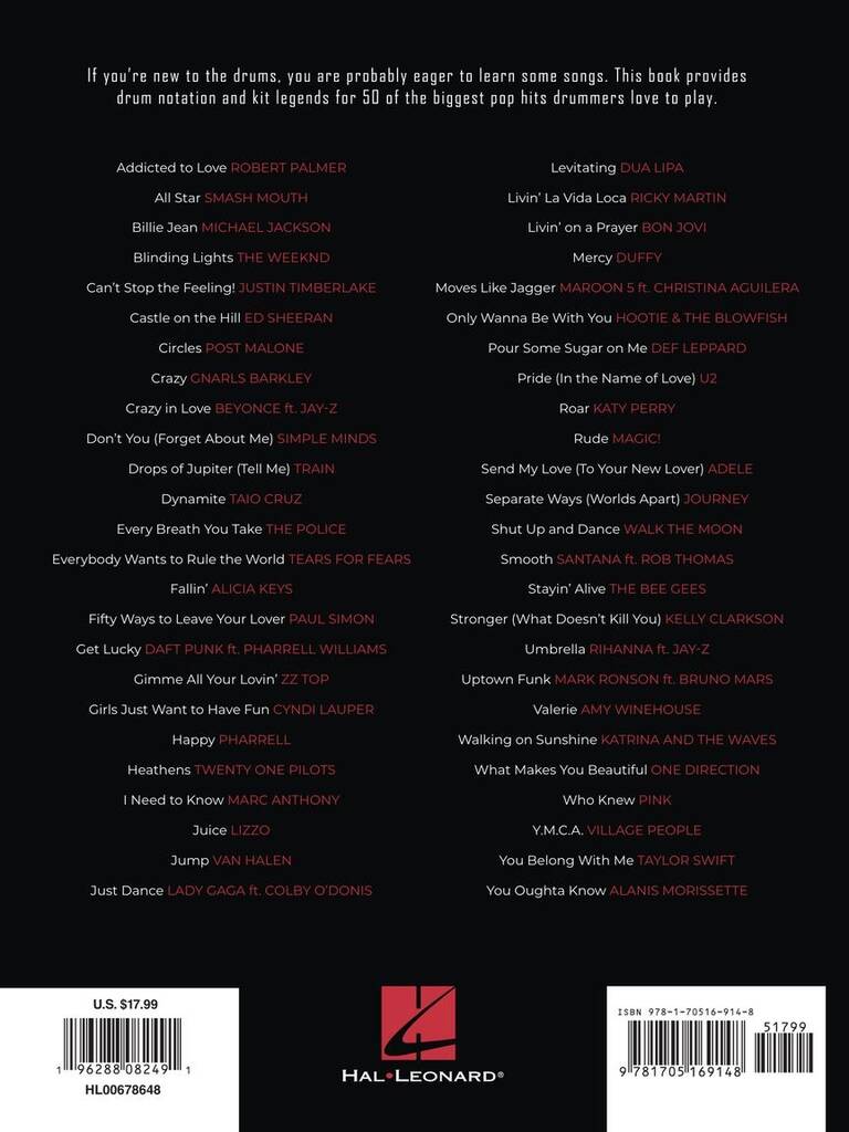 Si vous êtes novice à la batterie, vous êtes probablement impatient d'apprendre de nouveaux morceaux. Ce recueil comprend 50 tubes ludiques et accessibles et vous offrira le meilleur de la pop et du rock des dernières décennies de The Police à Alicia Keys et d'Adele à Van Halen. Titres inclus : Billie Jean · Blinding Lights · Can't Stop the Feeling! · Circles · Crazy in Love · Fifty Ways to Leave Your Lover · Happy · Juice · Levitating · Livin' La Vida Loca · Only Wanna Be with You · Separate Ways (Worlds Apart) · Smooth · Uptown Funk · et bien d'autres.
