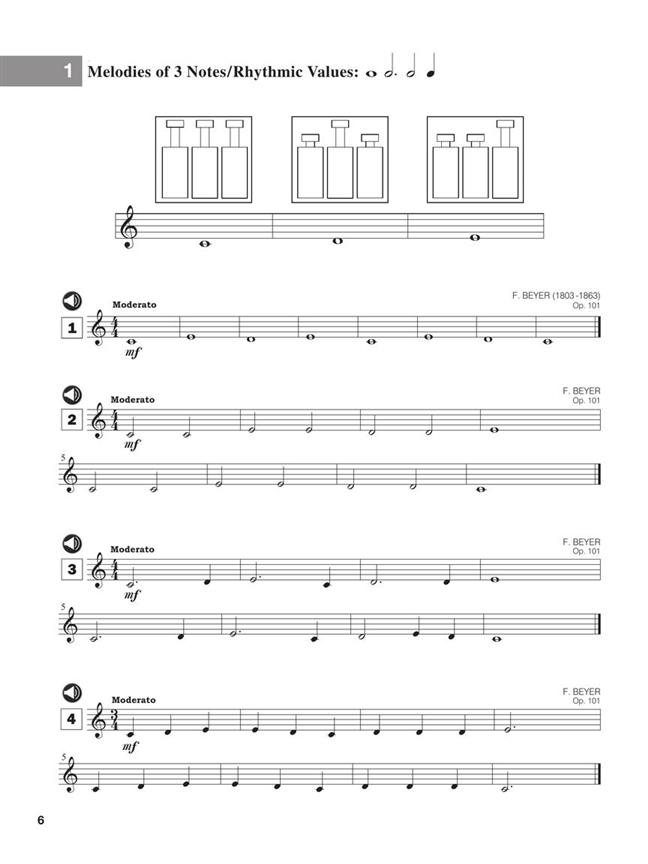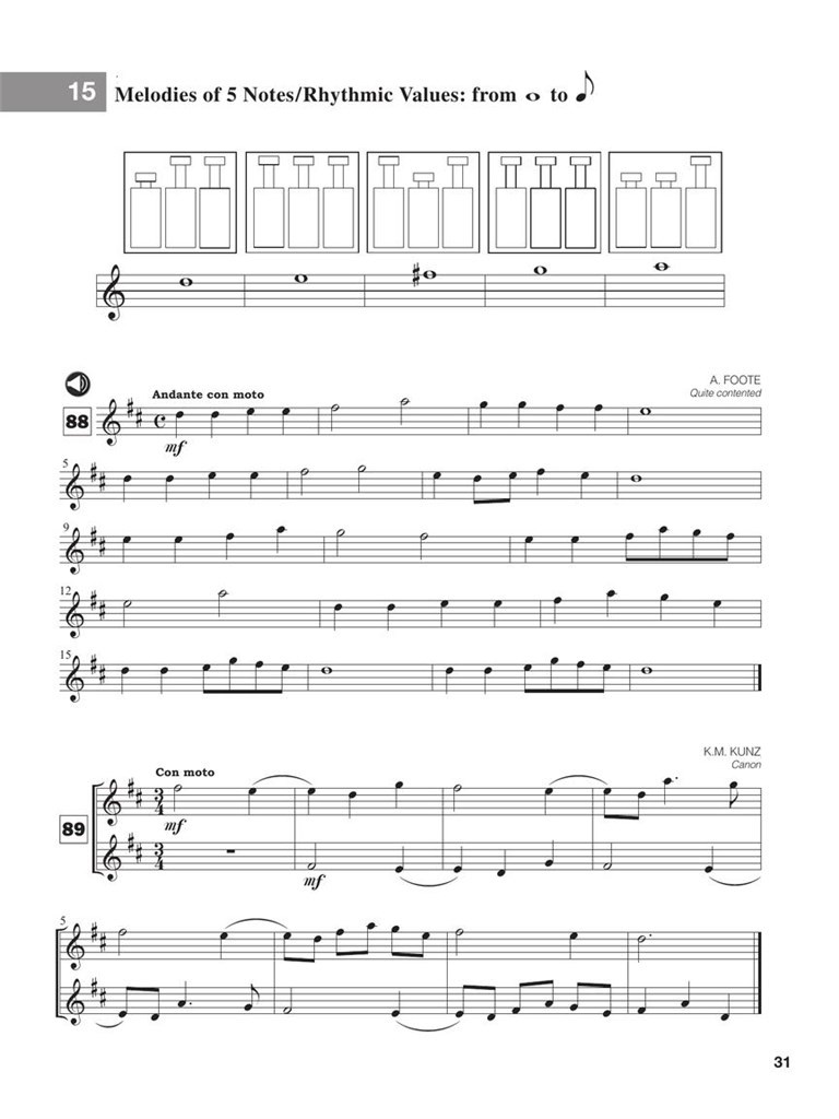 Les 100 mélodies courtes sont toutes composées de trois notes au minimum et huit au maximum. Seules les valeurs rythmiques de base sont utilisées, de la croche à la ronde. Les œuvres, classées par ordre de difficulté, se trouvent dans les clés les plus appropriées pour chaque instrument.
