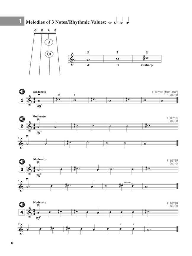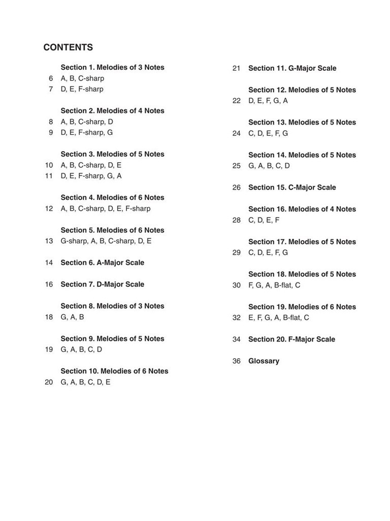 Les 100 mélodies courtes sont toutes composées de trois notes au minimum et huit au maximum. Seules les valeurs rythmiques de base sont utilisées, de la croche à la ronde. Les œuvres, classées par ordre de difficulté, se trouvent dans les clés les plus appropriées pour chaque instrument.