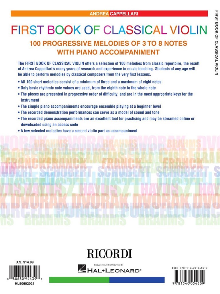 The First Book of Classical Instruments propose une sélection de 100 mélodies issues du répertoire classique, fruit de nombreuses années de recherche et d'expériences réalisées par Andrea Cappellari dans l'enseignement de la musique. Les étudiants de tout âge pourront jouer des mélodies de compositeurs classiques dès les premières leçons.