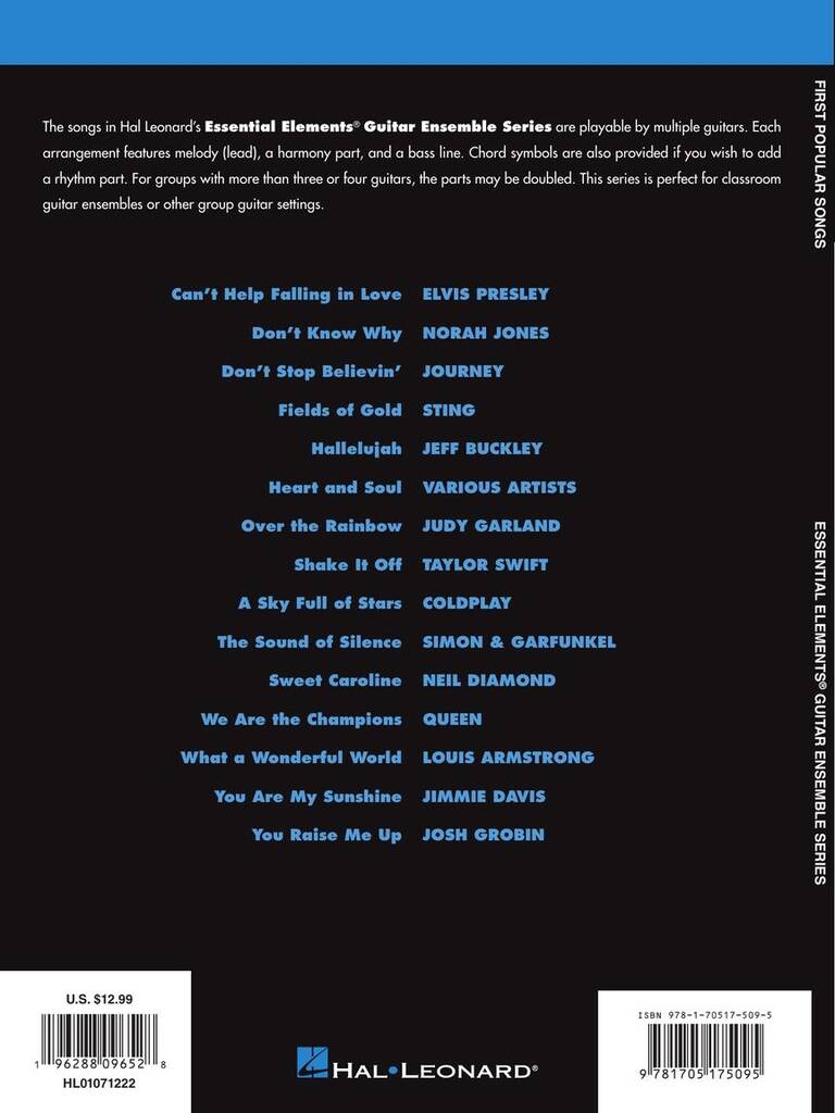 Les chansons de la collection Essential Elements® Guitar Ensemble Series d'Hal Leonard sont parfaites pour jouer de la guitare en groupe. Chaque arrangement comprend une ligne mélodique (lead), une partie harmonique et une ligne de basse. Pour les ensembles plus nombreux, les parties peuvent être doublées, ce qui rend cette collection parfaite pour les classes d'ensembles de guitares. Des symboles d'accords sont également fournis si vous souhaitez ajouter une partie rythmique. Cette édition comprend 15 tubes de musique pop.