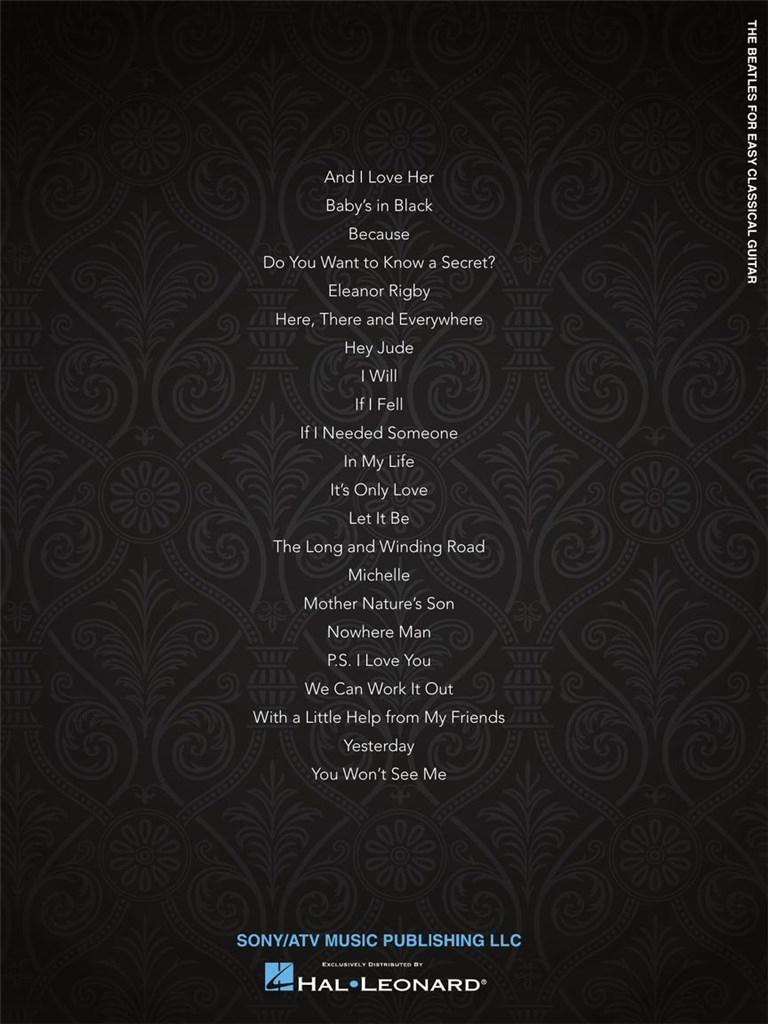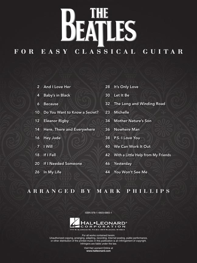 The Beatles: For Easy Classical Guitar dispose de 22 chansons du Fab Four, soigneusement disposés en notation standard et tablature, y compris et je l'aime, Eleanor Rigby, Let It Be, nous pouvons le travailler, Hier et plus.