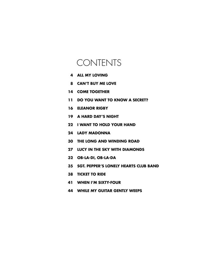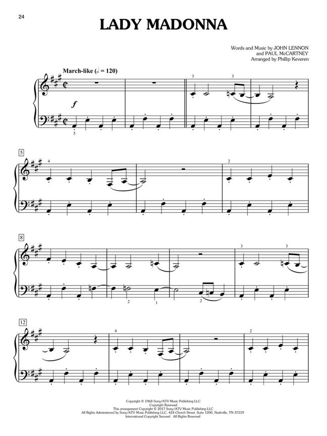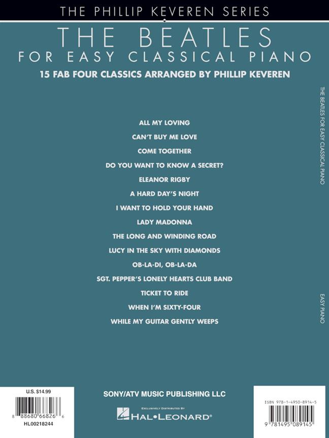 15 favourite songs of the Fab Four are masterfully presented in a classical style for easy piano by Phillip Keveren. Includes: All My Loving, Can't Buy Me Love, Eleanor Rigby, A Hard Day's Night, I Want to Hold Your Hand, Lucy in the Sky with Diamonds, Ob-La-Di, Ob-La-Da, Ticket to Ride, When I'm Sixty-Four and more.