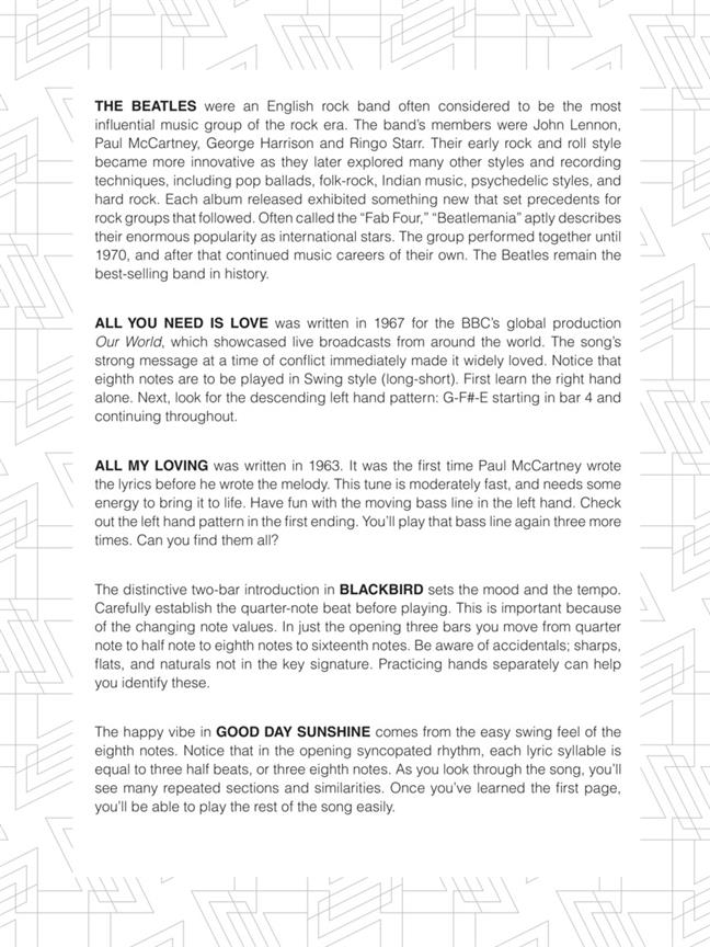 14 Fab Four favorites arranged for easy piano with practice tips for learning each song.
