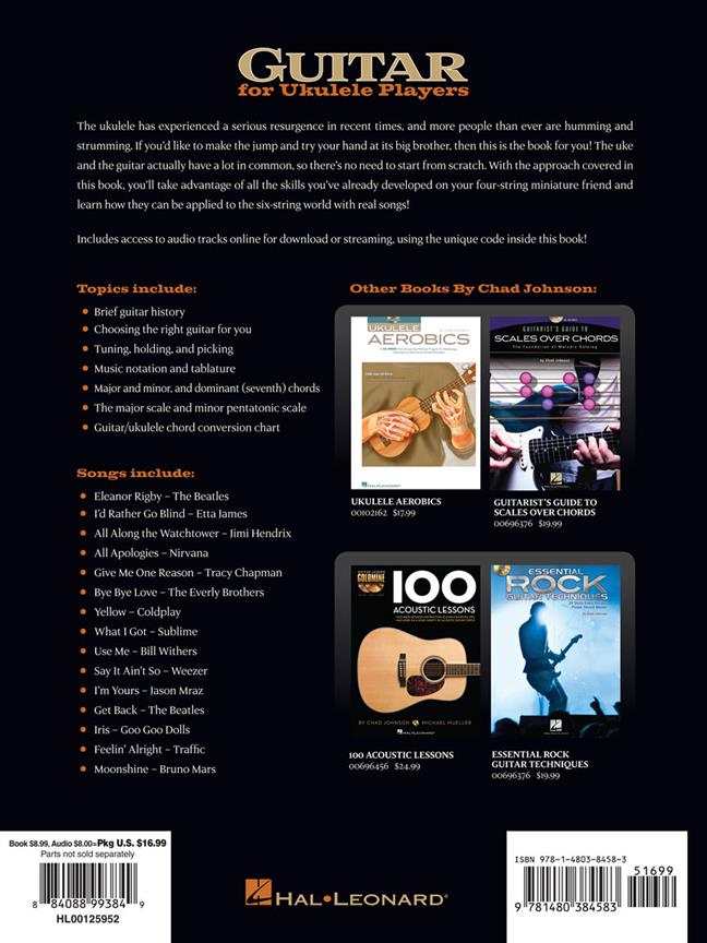 Includes access to audio tracks online for download or streaming, using the unique code inside this book. Topics include: brief Guitar history- choosing the right Guitar for you- tuning, holding and picking- music notation and tablature- major and minor, and dominant (seventh) chords- the major scale and minor pentatonic scale- Guitar/Ukulele conversion chart.