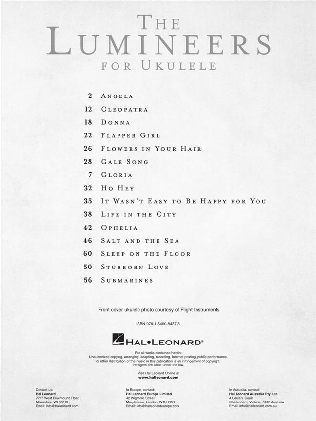 15 songs to strum and sing from this Colorado-based band are presented in ukulele arrangements including melody, lyrics and chord diagrams for G-C-E-A tuning.