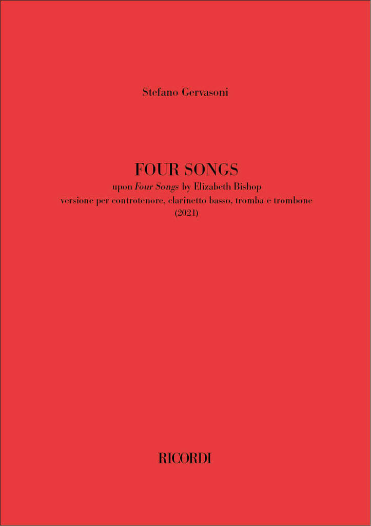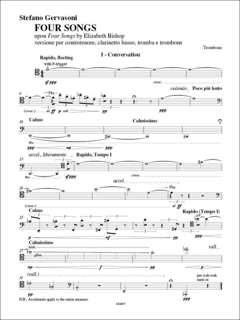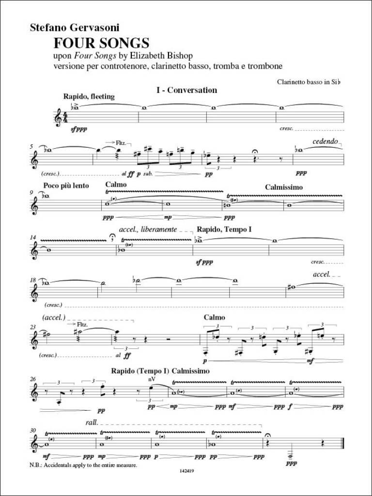 • Sous titre : upon Four Songs by Elizabeth Bishop versione per controtenore, clarinetto basso, tromba, trombone(20
