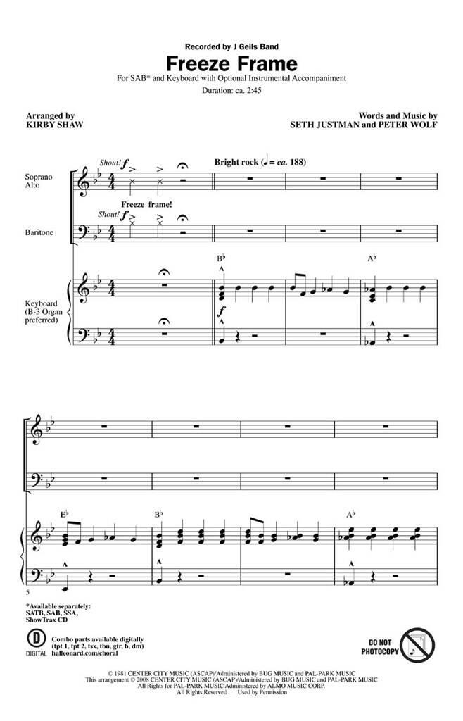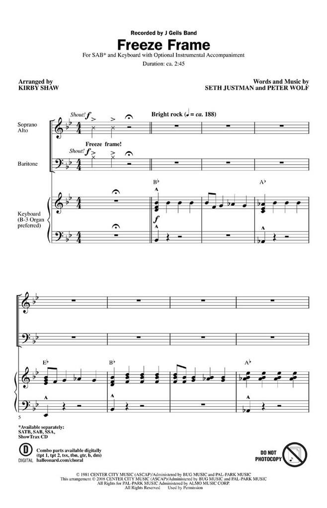 Retour en arrière dans les années 80 ! Ce tube pop de 1982 du J. Geils Band est une icône du rock 'n' roll qui fait d’un chœur de spectacle surdimensionné une puissance ! Inarrêtable ! Disponibles séparément : SATB, SAB, SSA, ShowTrax CD. Pièces combinées disponibles en numérique (tpt 1, tpt 2, tsx, tbn, gtr, b, dm). Durée : environ 2:45.
