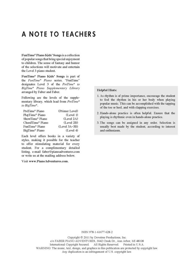 Cette nouvelle collection de chansons pour enfants se divertir et d'encourager le pianiste début intermédiaire. Soigneusement classés de niveau 3A-3B étudiants puissent en profiter, cette collection comprend: Vous avez Got a Friend in Me - - Consider Yourself Be Our Guest - Yellow Submarine - Walking On Sunshine - Thème de la famille Le Addam de - et plus encore.