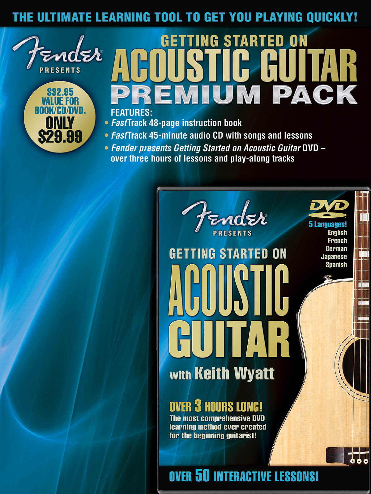 Ce pack économiser de l'argent possède le livre de 48 pages FastTrack Guitar Method, un CD de 45 minutes FastTrack audio complet avec des chansons et des leçons, et le Fender DVD présente Démarrage à la guitare acoustique - pistes contenant plus de trois heures de cours et de play-along !