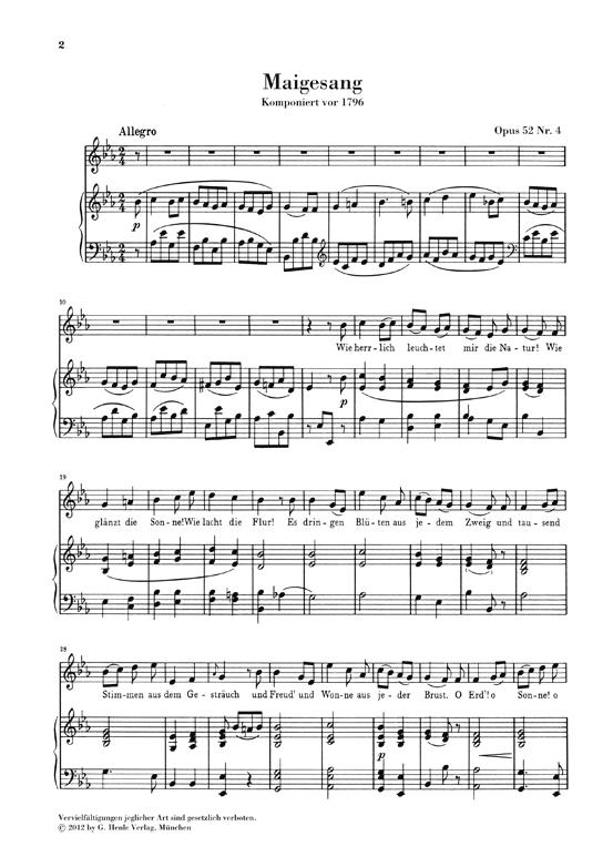 Maigesang „Wie herrlich leuchtet mir die Natur" op. 52/4, Marmotte „Ich komme schon durch manche Land" op. 52/7, Sehnsucht „Nur wer die Sehnsucht kennt" WoO 134 (4 Vertonungun), Kennst Du das Land „Kennst Du das Land?" op. 75/1, Neue Liebe, neues Leben „Herz, mein Herz, was soll das geben?" op. 75/2, Aus Goethes Faust „Es war einmal ein König" op. 75/3, Wonne der Wehmut „Trocknet nicht" op. 83/1, Sehnsucht „Was zieht mir das Herz so?" op. 83/2, Mit einem gemalten Band „Kleine Blumen" op. 83/3, Freudvoll und leidvoll „Freudvoll und leidvoll" op. 84/4 (2. Fassung), Anhang: Neue Liebe, neues Leben „Herz, mein Herz, was soll das geben?" WoO 127, Wonne der Wehmut „Trocknet nicht" Hess 142, Erlkönig „Wer reitet so spät" WoO 131
