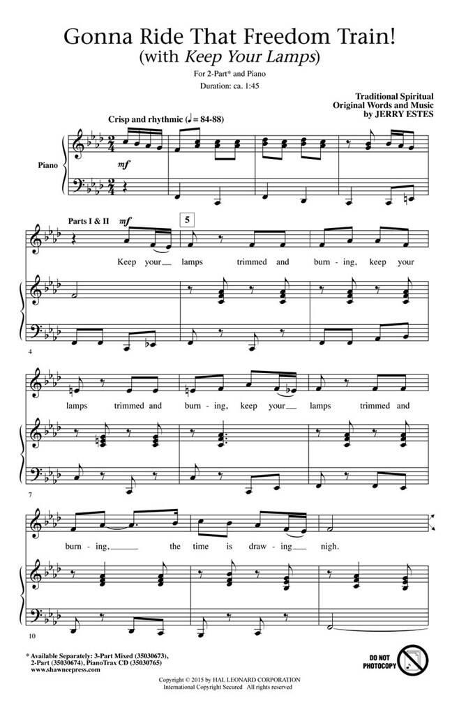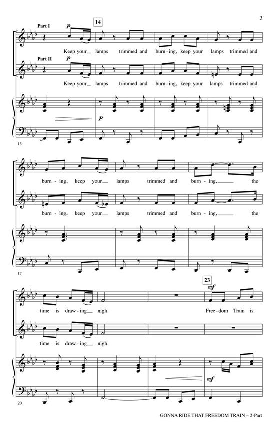 Une écriture nette et rythmée crée la mélodie originale associée au spirituel Keep Your Lamps. Un excellent choix pour les voix jeunes et en développement utilisant de courtes phrases musicales qui s’entrelacent tout au long du film, créant un processus d’apprentissage et une performance passionnants. Le piano est soutenant et a l’effet d’un train roulant sur la voie, maintenant cette disposition fluide mais ponctuée.