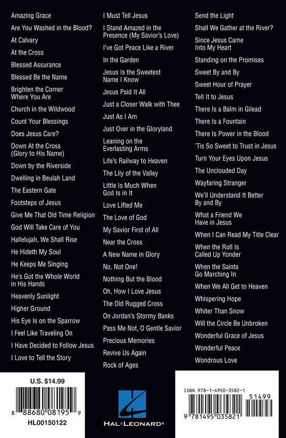80 gospel favorites, including: Amazing Grace - Blessed Assurance - Down by the Riverside - His Eye Is on the Sparrow - I Love to Tell the Story - Just a Closer Walk with Thee - Near the Cross - Rock of Ages - There Is a Balm in Gilead - What a Friend We Have in Jesus - Will the Circle Be Unbroken - and many more.