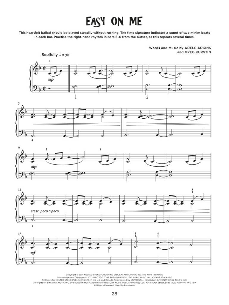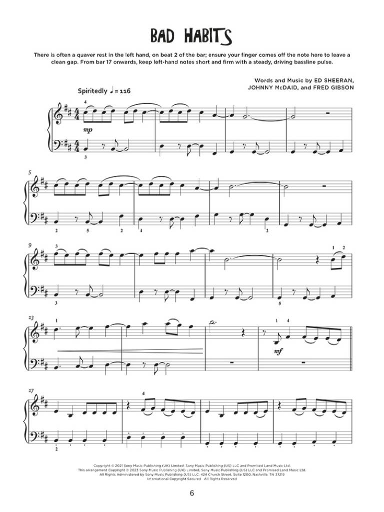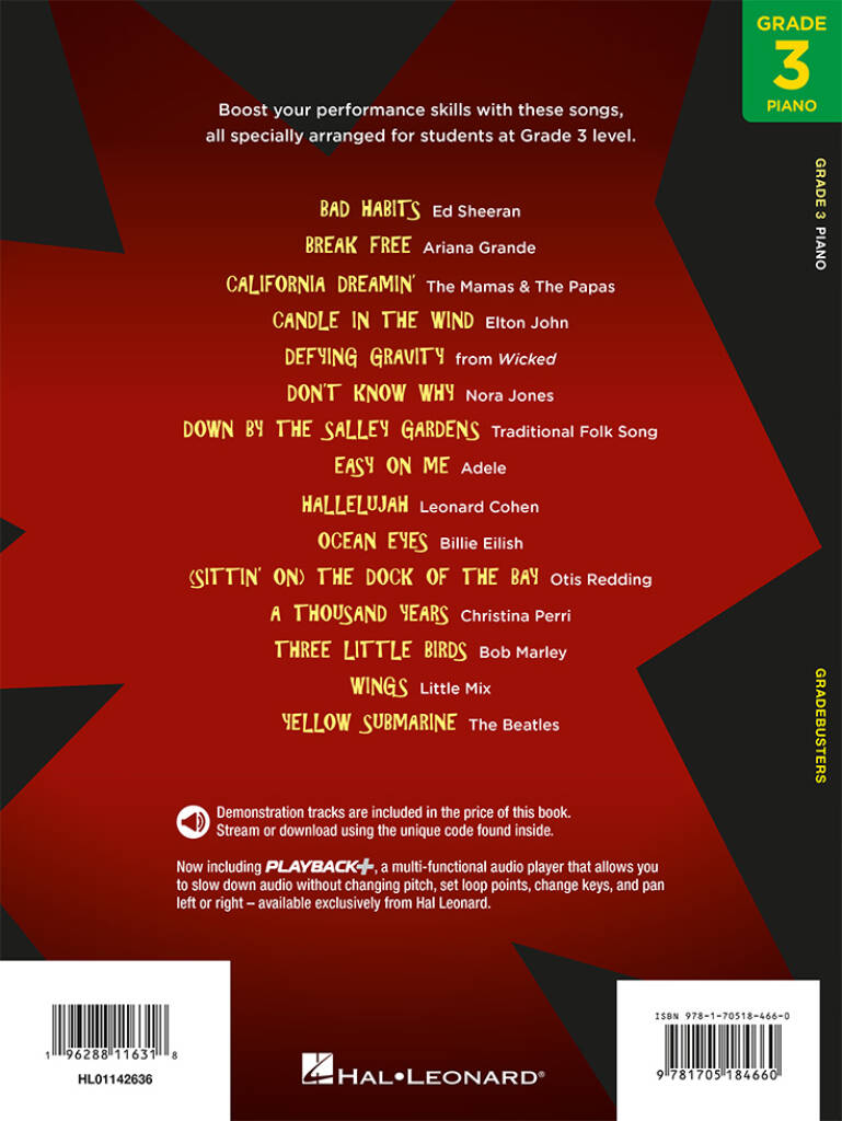 Boost your performance with these songs, all specially arranged for students at Grade 3 level. Songs include “Bad Habits” (Ed Sheeran), “Break Free” (Ariana Grande), “Defying Gravity” (Wicked), “Easy on Me” (Adele), “Wings” (Little Mix) and more. Demonstration tracks are included in the price of this book and can be streamed or downloaded using the unique code found inside.