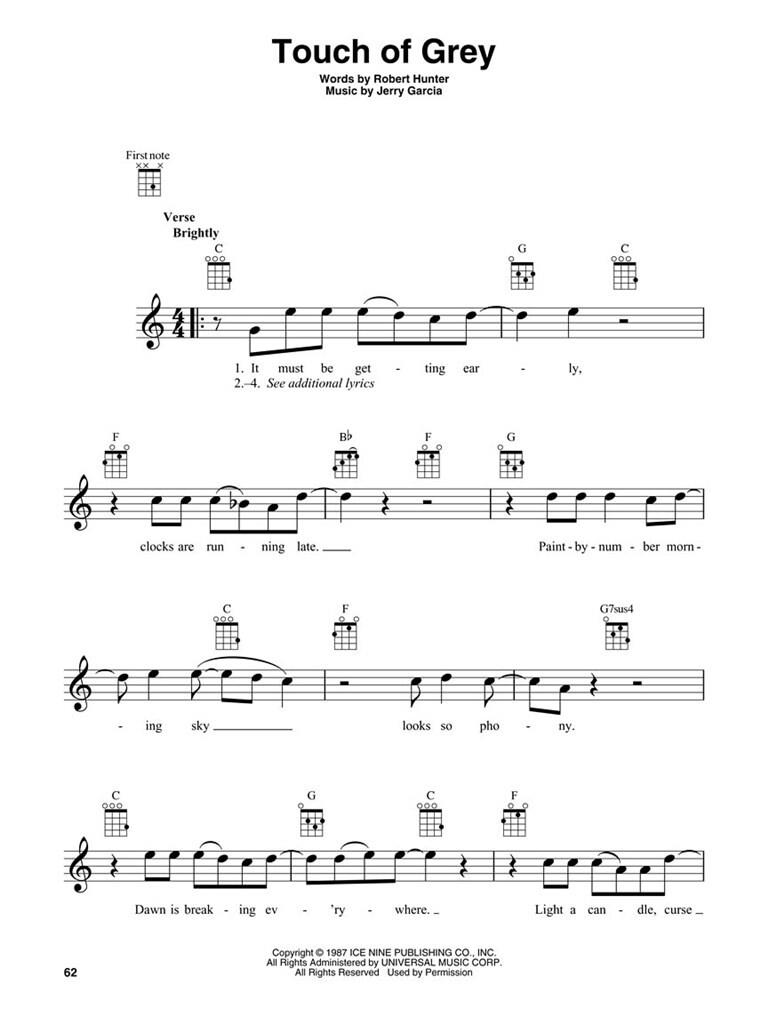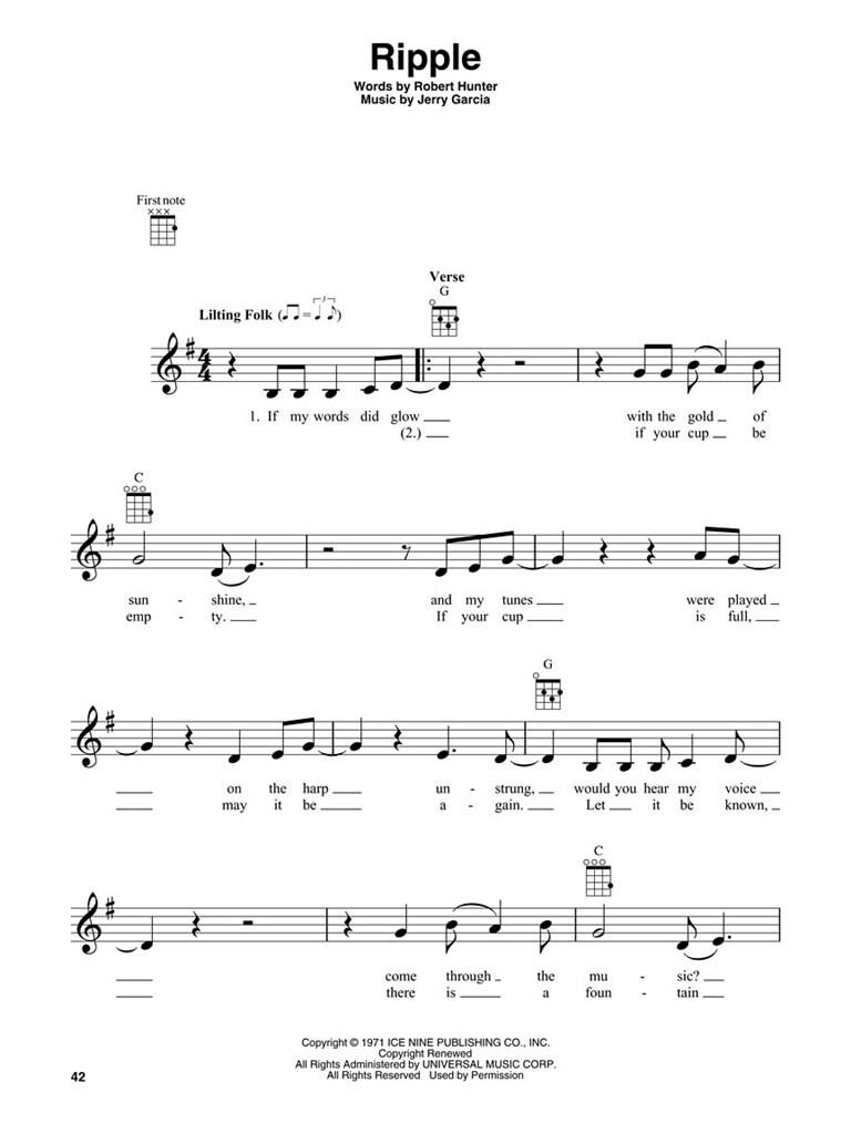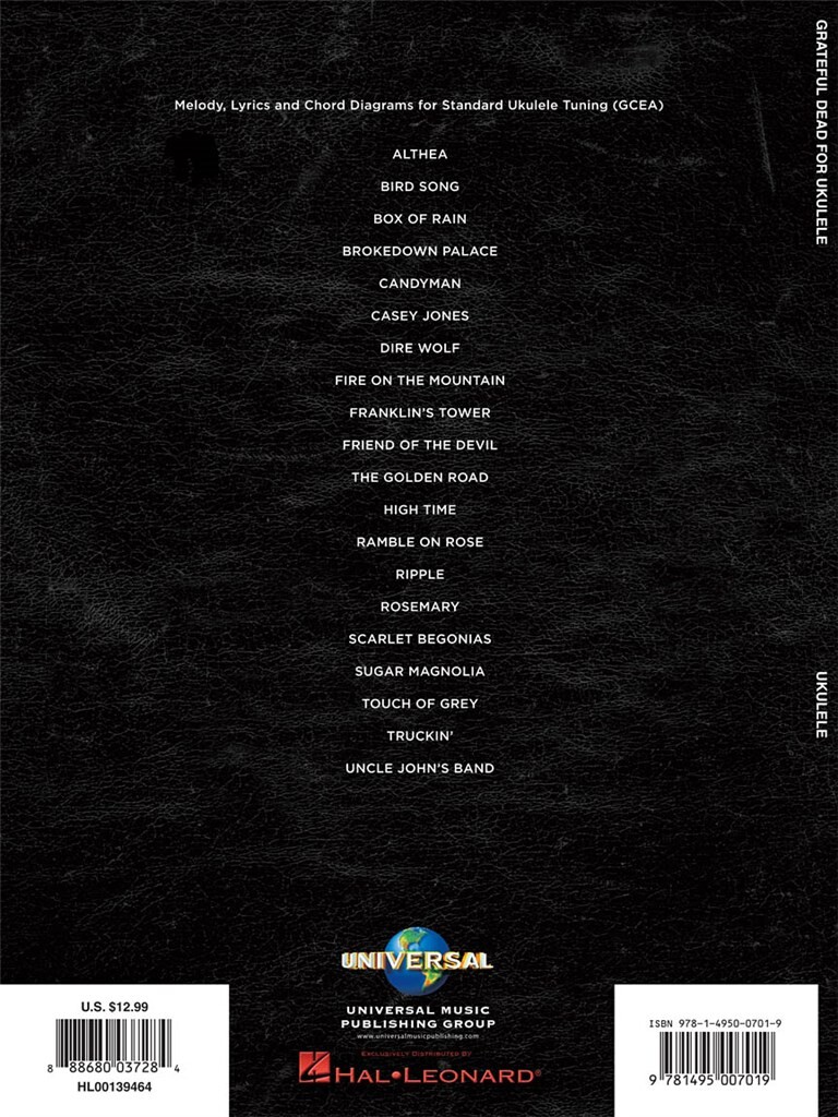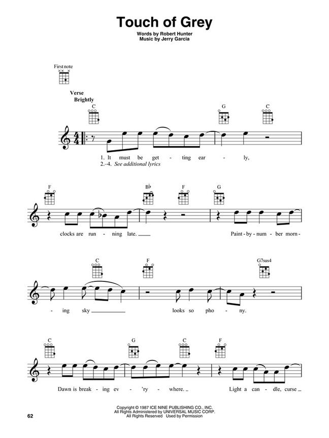 Now Dead Heads can strum along to 20 of their favorites on the ukulele! This collection brings together the melody, lyrics and chord diagrams in standard GCEA ukulele tuning for the songs: Box of Rain · Brokedown Palace · Casey Jones · Friend of the Devil · The Golden Road · Ripple · Sugar Magnolia · Touch of Grey · Truckin' · Uncle John's Band · and more.