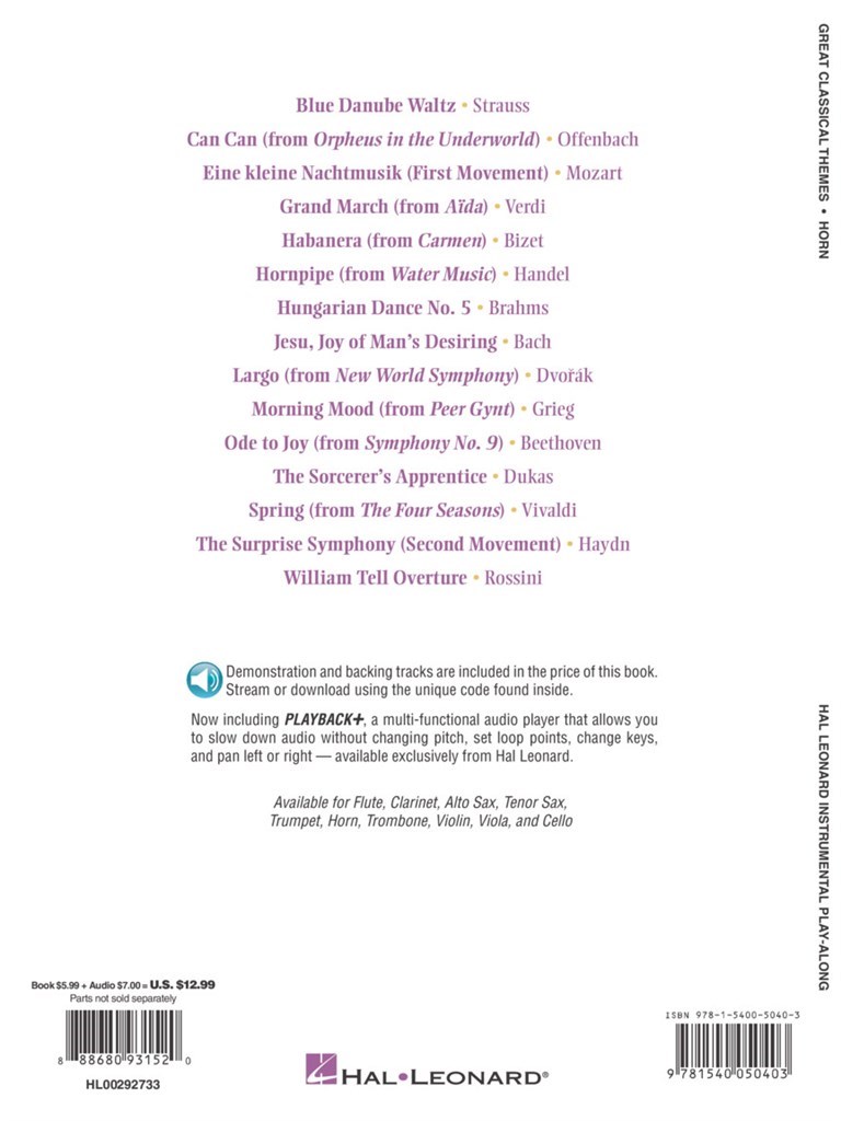 15 timeless and familiar classical themes in arrangements perfect for budding instrumentalists. It features online access to audio demonstration and backing tracks for download or streaming to help you hear how the song should sound then play along and sound like a pro! Includes: Blue Danube Waltz (Strauss) - Can Can (from Orpheus in the Underworld) (Offenbach) - Jesu, Joy of Man's Desiring (J.S. Bach) - Morning Mood (from Peer Gynt) (Grieg) - Ode to Joy (from Symphony No. 9) (Beethoven) - William Tell Overture (Rossini) - and more.