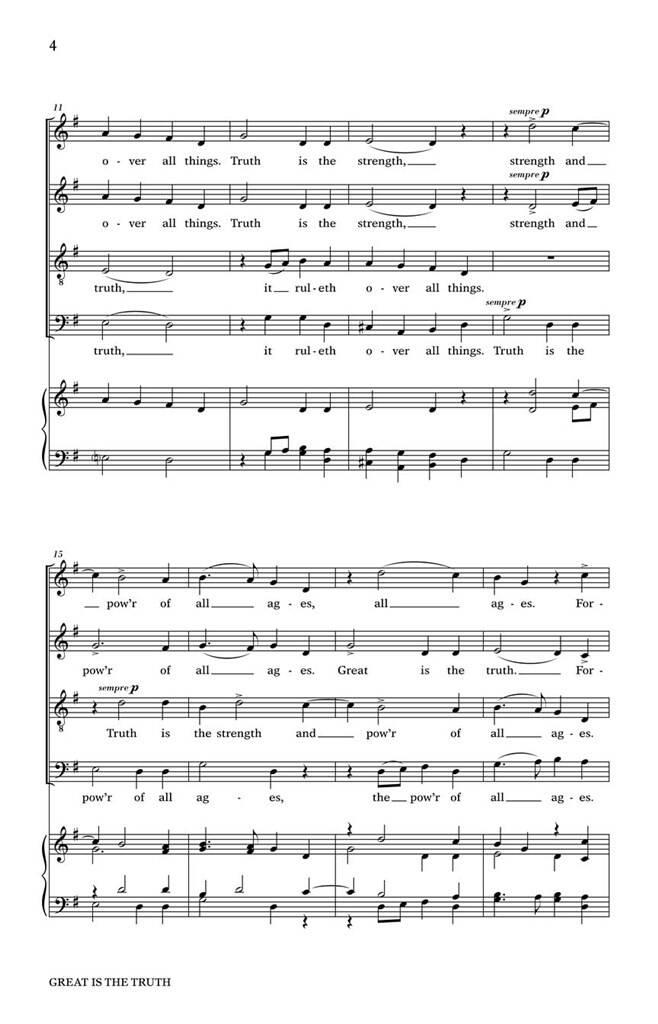 Écrite dans un style dramatique quasi hanélien/bachien afin de donner à cette toute nouvelle pièce une qualité intemporelle. Et une qualité intemporelle est exactement ce que la Vérité exige de nous tous. Le texte, adapté par le compositeur à partir de sources de l’Ancien Testament, donne aux chanteurs un sentiment de lutte contre les mensonges auxquels nous sommes confrontés chaque jour.