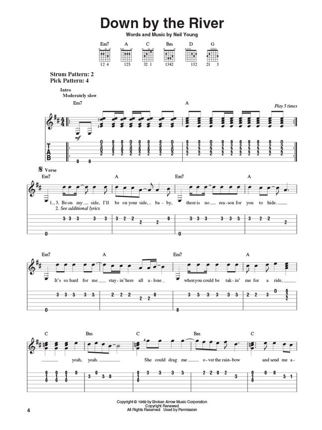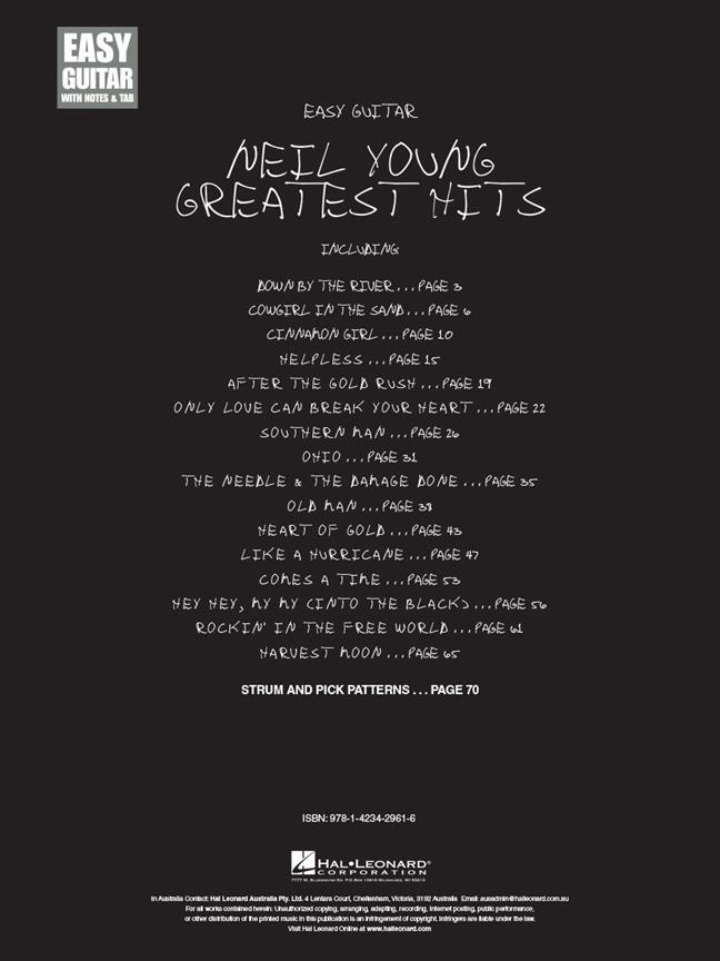 Partitions pour chant et guitare facile (diagrammes d'accords et tablatures) du plus grands tubes de Neil Young. Paroles complètes sur pages séparées.