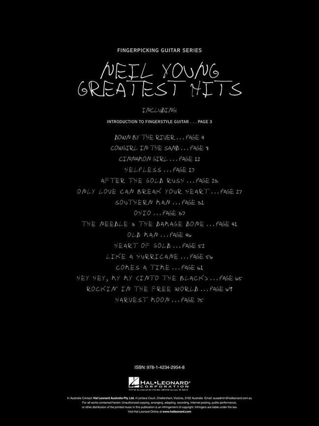 Disponible ici est une fantastique sélection des plus grands tubes de Neil Young et des chansons les plus influents, compilés dans une collection pour guitare fingerpicking avec ligne notation, onglet et la mélodie standard.