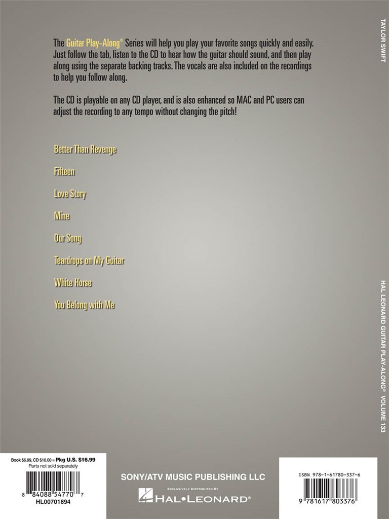 Le Guitar Play-Along Series vous aidera à jouer vos chansons préférées rapidement et facilement! Il suffit de suivre la liste des onglets, le CD pour entendre comment la guitare doit sonner, puis jouer en utilisant la piste d'accompagnement séparée. La mélodie et les paroles sont aussi incluses dans le livre au cas où vous voulez chanter, ou tout simplement pour vous aider à suivre. Le CD audio est jouable sur n'importe quel lecteur CD, et donc amélioré dim. PC and Mac pouvez ajuster l'enregistrement à n'importe quel tempo sans changer la hauteur!