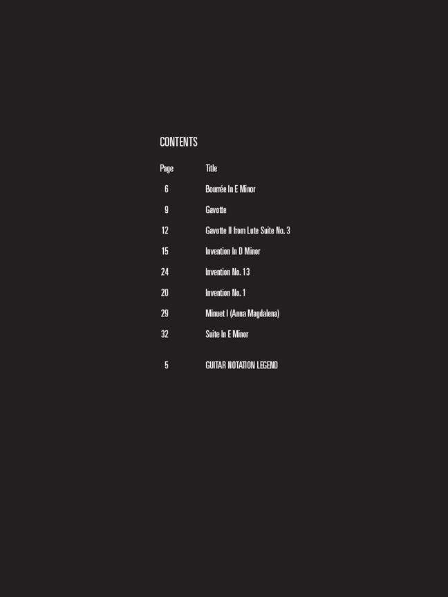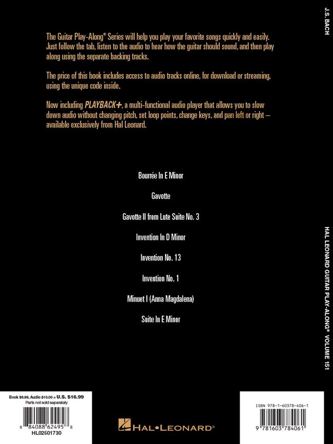 The Guitar Play-Along Series will help you play your favorite songs quickly and easily! Just follow the tab, listen to the audio to hear how the guitar should sound, and then play along using the separate backing tracks. This unique volume allows you to play Bach duets with both parts on the audio so you can play either part along with a professional. The audio is available online for download or streaming, and it is enhanced so you can adjust the recording to any tempo without changing pitch! 8 pieces: BourrÚe in E Minor - Gavotte - Gavotte II from Lute Suite #3 - Invention in D Minor - Invention #1 - Invention #13 - Minuet I (Anna Magdalena) - Suite in E Minor.