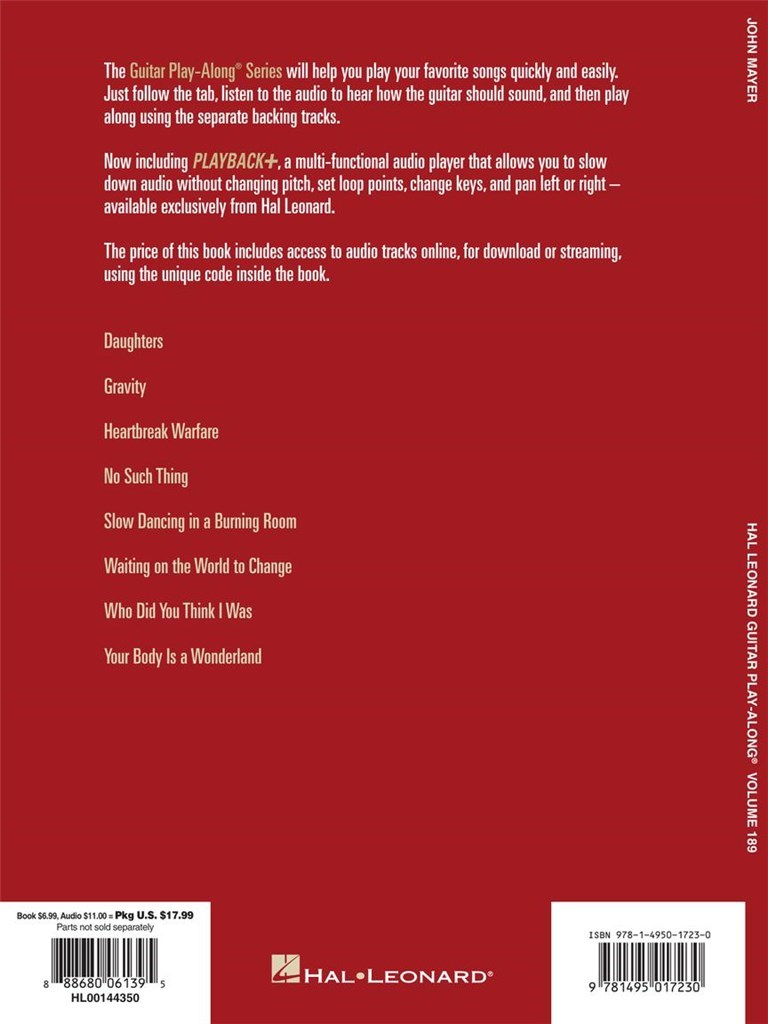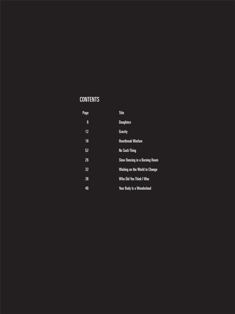 This volume features 8 John Mayer songs: Daughters, Gravity, Heartbreak Warfare, No Such Thing, Slow Dancing in a Burning Room, Waiting on the World to Change, Who Did You Think I Was and Your Body Is a Wonderland.
