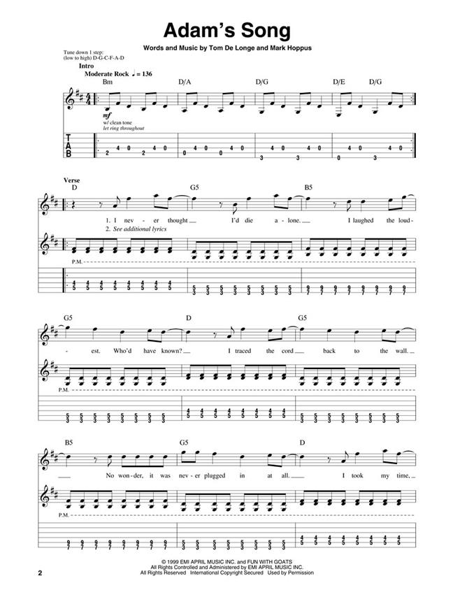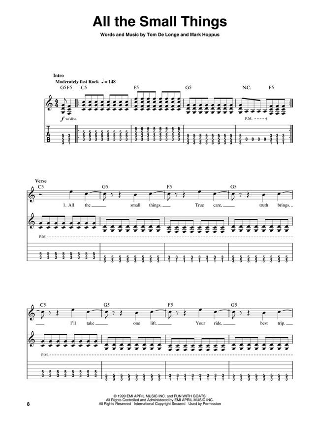 Partitions pour chant et guitare (tablatures et symboles d'accords) de 8 hits du célèbre groupe de punk/rock américain des années 90, Blink-182.