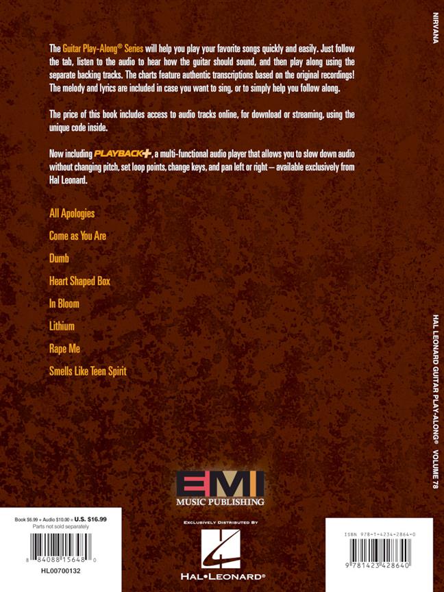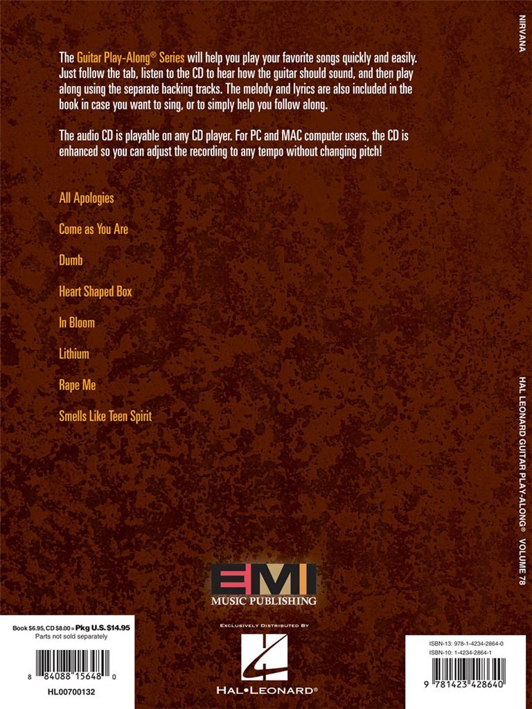 Le jouer de la guitare-Along série vous aidera à jouer vos chansons préférées rapidement et facilement! Il suffit de suivre l'onglet, écoutez le CD pour entendre comment la partie de guitare, et ainsi jouer en utilisant les pistes d'accompagnement séparée. La mélodie et les paroles sont également inclus dans le livre au cas où vous voulez chanter, ou tout simplement pour vous aider à suivre. Le CD audio est jouable sur n'importe quel lecteur CD. Pour les utilisateurs PC et Mac, le CD est fourni pour vous permettre d'ajuster la à n'importe quel tempo sans changer la hauteur! 8 chansons, y compris: All Apologies - Come As You Are Dumb - - - Heart Shaped Box In Bloom - Lithium - - Rape Me Smells Like Teen Spirit.