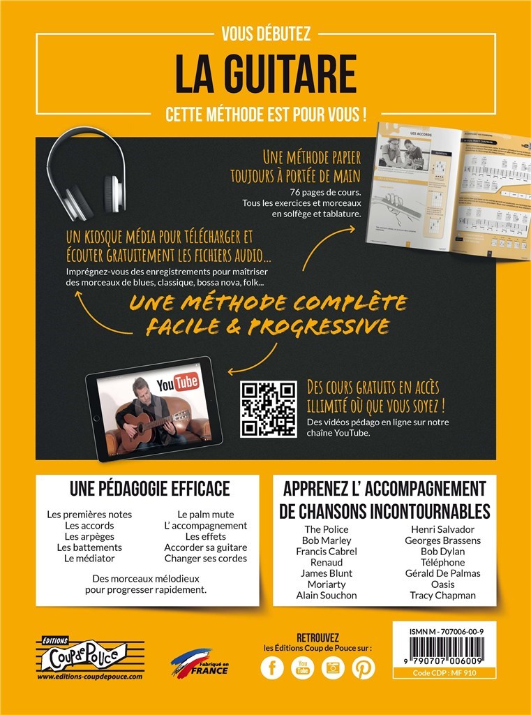 Cette méthode vous apprendra : vos premiers accords, les arpèges, des morceaux classiques, folk, country, etc. Accompagnez vos chansons dans les styles de : Duteil, Cabrel, Lavilliers, Le Forestier, etc. L'ABC du solfège, mini dictionnaire d'accords. méthode comprend aussi de nombreux conseils et astuces pour accorder sa guitare, choisir et changer ses cordes, etc...