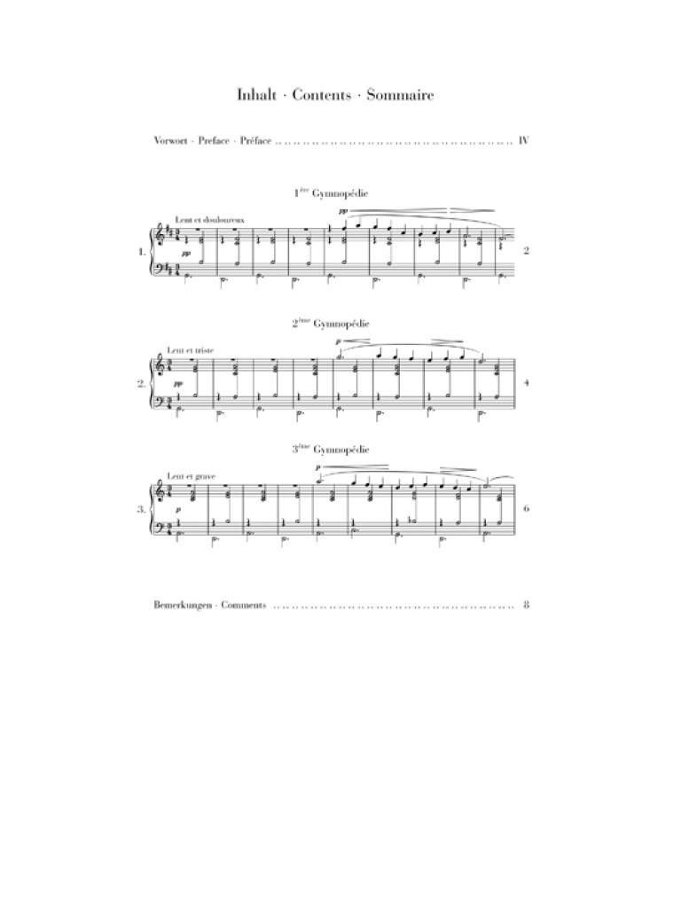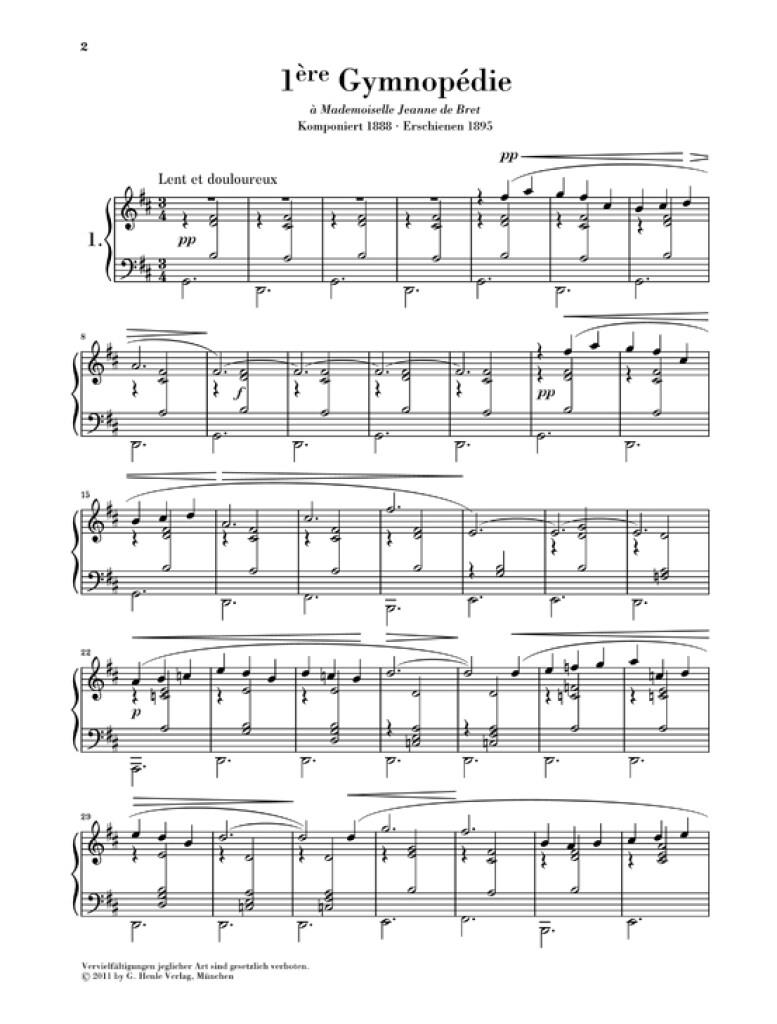 Personnage à la personnalité très affirmée et extravagant individualiste, Satie se distança sciemment des traditions musicales romantiques héritées du XIXe siècle. Ses trois miniatures pour le piano intitulées "Gymnopédies" sont les premiers témoignages de son idée de "nouvelle simplicité": des rythmes répétés obsédants imitant des danses cultuelles antiques produisent un charme méditatif tout à fait particulier. Un des principes de Satie consistant à aligner des blocs constitutifs, plutôt que de les soumettre à un développement bien précis, ouvrira de larges perspectives à plusieurs courants musicaux du XXe siècle. Bien équilibrée, la gravure de notre édition Urtext aurait sans doute réjoui Satie, lequel aimait apporter un soin tout particulier à la calligraphie de ses partitions.