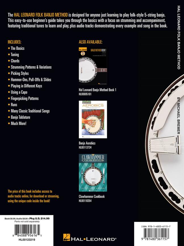 The Hal Leonard Folk Banjo Method is designed for anyone just learning to play folk-style 5-string banjo. This easy-to-use beginner's guide takes you through the basics with a focus on strumming and accompaniment, featuring traditional tunes to learn and play, plus audio tracks demonstrating every example and song in the book. The price of this book includes access to audio tracks online, for download or streaming, using the unique code inside the book! Covers: the basics- tuning- chords- strumming patterns and variations- picking styles- hammer-ons, pull-offs and slides- playing in different keys- and more.