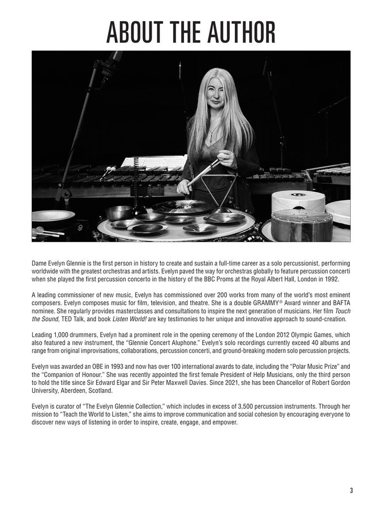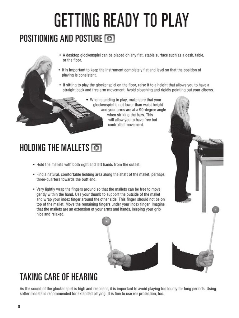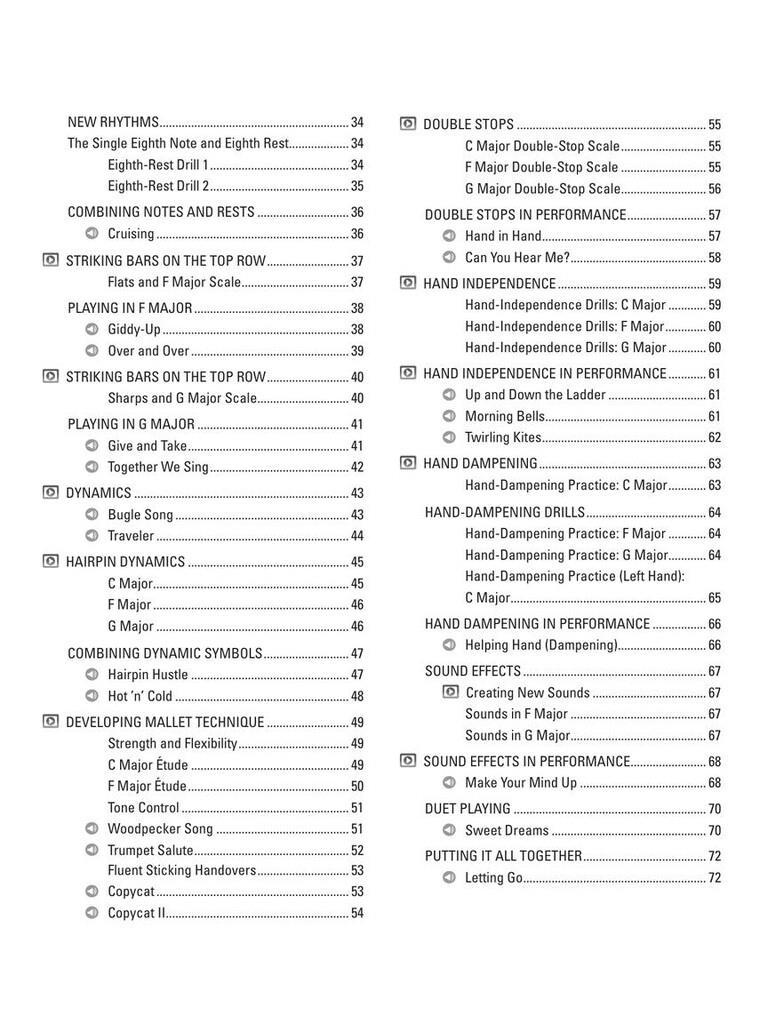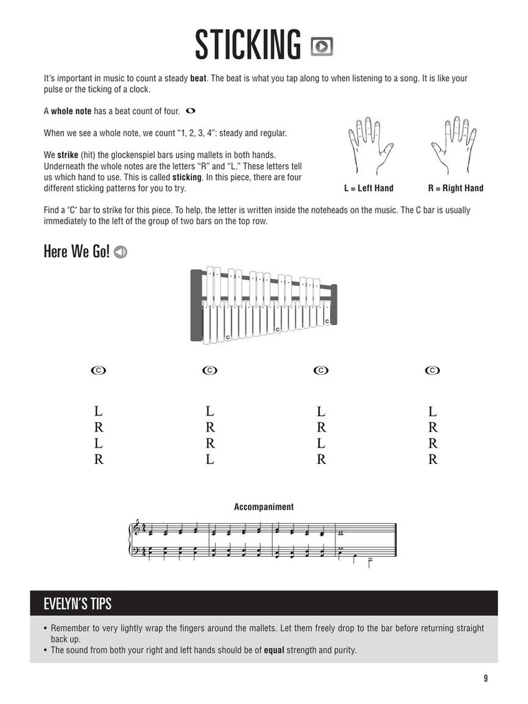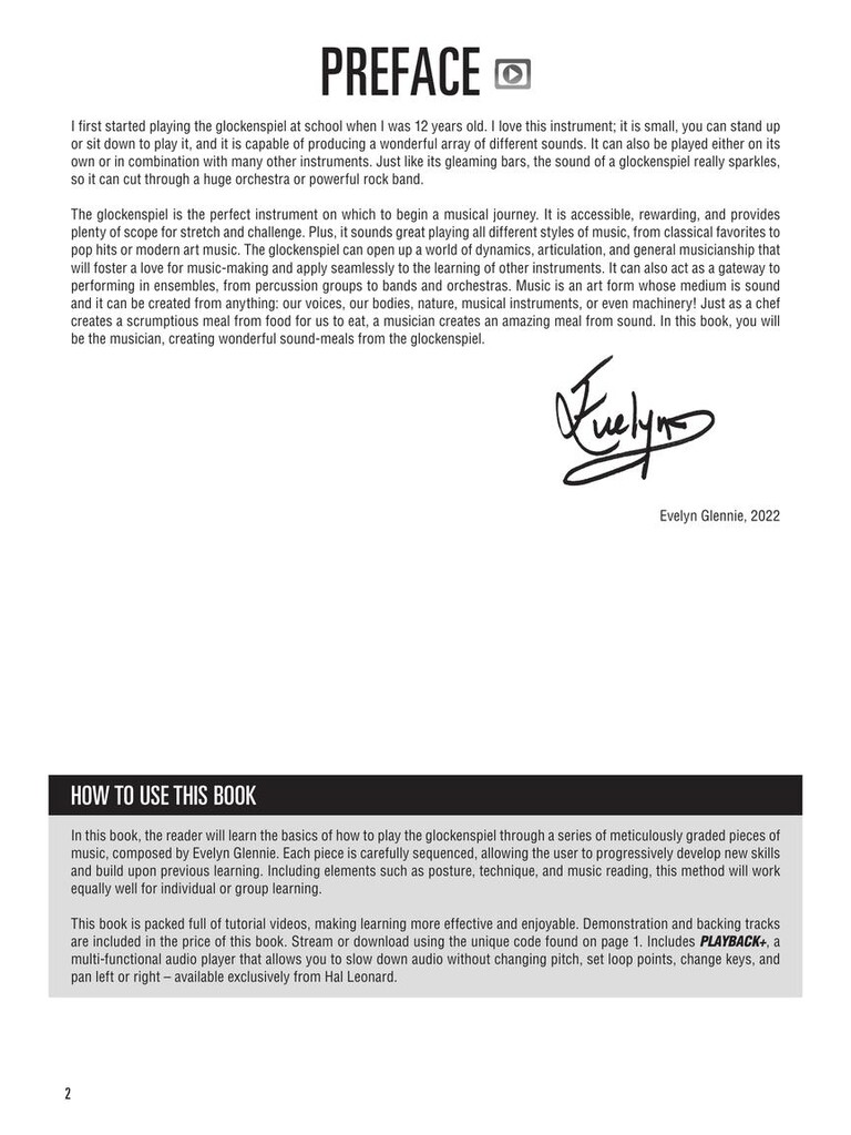 The Hal Leonard Glockenspiel Method is designed for anyone just learning to play the glockenspiel. This easy-to-use guide provides step-by-step lessons and meticulously graded music by leading percussionist Dame Evelyn Glennie. Video tutorials, demonstration audio, and accompaniment backing tracks are also included, making this book ideal for individual or group learning. Concepts include: ·Music reading skills · The geography of the glockenspiel · Positioning, posture, and holding mallets · Striking the bars · Sticking · Playing melodies: steps and skips · Dynamics · Mallet technique · Double stops · Hand independence · Hand dampening · Sound effects · Original compositions by Evelyn Glennie · Video tutorials, demonstration audio, and accompaniment backing tracks