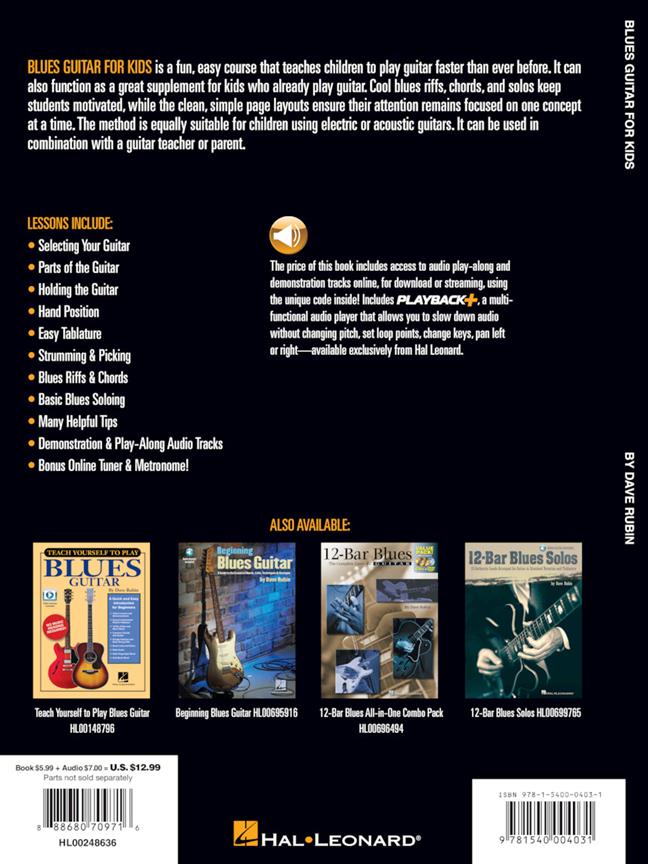 Blues Guitar for Kids is a fun, easy course that teaches children to play guitar faster than ever before. It can also function as a great supplement for kids who already play guitar. Cool blues riffs, chords and solos keep students motivated, while the clean, simple page layouts ensure their attention remains focused on one concept at a time. The method is equally suitable for children using electric or acoustic guitars. It can be used in combination with a guitar teacher or parent. Lessons include: selecting your guitar - parts of the guitar - holding the guitar - hand position - easy tablature - strumming and picking - blues riffs and chords - basic blues soloing -and more. Demonstration and play-along audio tracks as well as a metronome and tuner are provided online. Blues Guitar for Kids is a fun, easy course that teaches children to play guitar faster than ever before. It can also function as a great supplement for kids who already play guitar. Cool blues riffs, chords and solos keep students motivated, while the clean, simple page layouts ensure their attention remains focused on one concept at a time. The method is equally suitable for children using electric or acoustic guitars. It can be used in combination with a guitar teacher or parent. Lessons include: selecting your guitar - parts of the guitar - holding the guitar - hand position - easy tablature - strumming and picking- blues riffs and chords - basic blues soloing - and more. Demonstration and play-along audio tracks as well as a metronome and tuner are provided online.