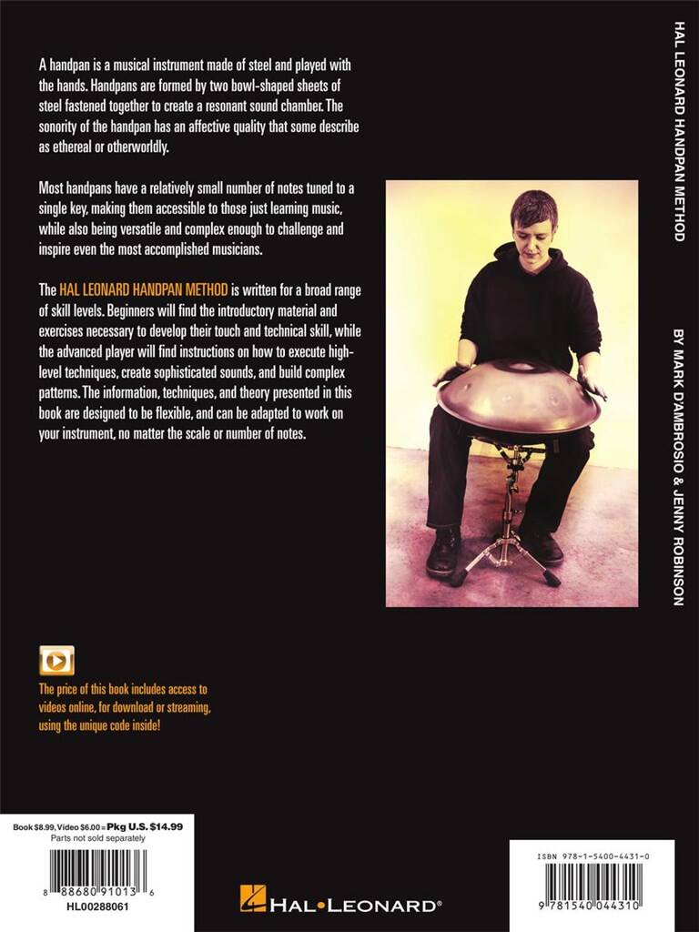 Un handpan est un instrument de musique en acier joué avec les mains. Les handpans sont formés par deux feuilles d’acier en forme de bol fixées ensemble pour créer une chambre sonore résonnante. La sonorité du handpan possède une qualité affective que certains décrivent comme éthérée ou surnaturelle. La plupart des handpans comportent un nombre relativement faible de notes accordées sur une seule tonalité, ce qui les rend accessibles à ceux qui apprennent la musique, tout en étant suffisamment polyvalents et complexes pour défier et inspirer même les musiciens les plus accomplis. La méthode Handpan de Hal Leonard est conçue pour un large éventail de niveaux de compétence. Les débutants trouveront le matériel d’introduction et les exercices nécessaires pour développer leur toucher et leurs compétences techniques, tandis que le musicien avancé trouvera des instructions sur la façon d’exécuter des techniques de haut niveau, de créer des sons sophistiqués et de construire des motifs complexes. Les informations, techniques et théories présentées dans ce livre sont conçues pour être flexibles et peuvent être adaptées à votre instrument, quel que soit le volume ou le nombre de notes. Le prix de ce livre inclut l’accès à des vidéos en ligne, à télécharger ou en streaming, en utilisant le code unique inclus à chaque achat.