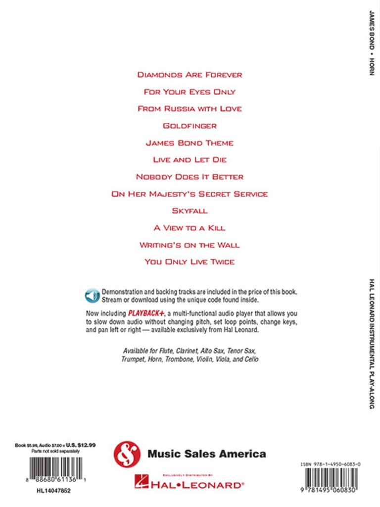 This volume in the Hal Leonard Instrumental Play-Along series contains 12 themes from the James Bond films in arrangements for solo Horn. A downloadable backing track is included for each piece so you can play along and sound like a pro!